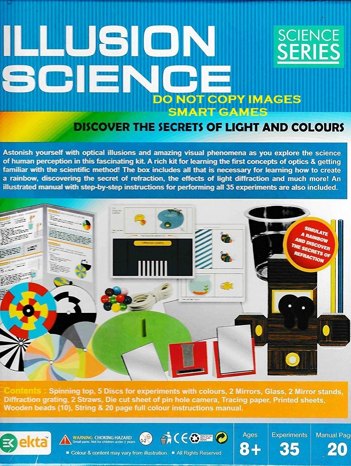 Illusion Science Kit for Kids with 35 Experiments Science Series, Learning and Educational DIY Kit. An Illusion Science kit for kids – Astonish yourself with optical illusions and amazing visual phenomena as you explore the science of human perception in this fascinating kit. Good for science experiments, physics, learning & educational. A rich kit for learning the first concepts of optics and getting familiar with the science method all 35 experiments also included. Discover the secrets of Light and Colours Explore Light, Optics and Perception! Amazing Optical Illusions 35 Experiments 20 Manual Pages For Ages 8+ Contents : Spinning top 5 Discs of experiments with colours 2 Mirrors Glass 2 Mirror Stands Diffraction grating 2 Straws Die cut sheet of pin hole camera Key Features: – Discover the secrets of light & colours in illusion Science Kit. Illusion Science kit is a Learning & Educational Game. Explore Light, Optics and Perception Amazing Optical Illusions. Improves children’s cognitive ability. Make fun while playing, Easy and clear instructions are provided inside. This is the perfect entertainment pack for your little ones. It’s a learning game for children. Improves children’s cognitive ability. Make fun while playing. Amazing Optical Illusions, A Science kit for Kids of 8 years, 35 Experiments.