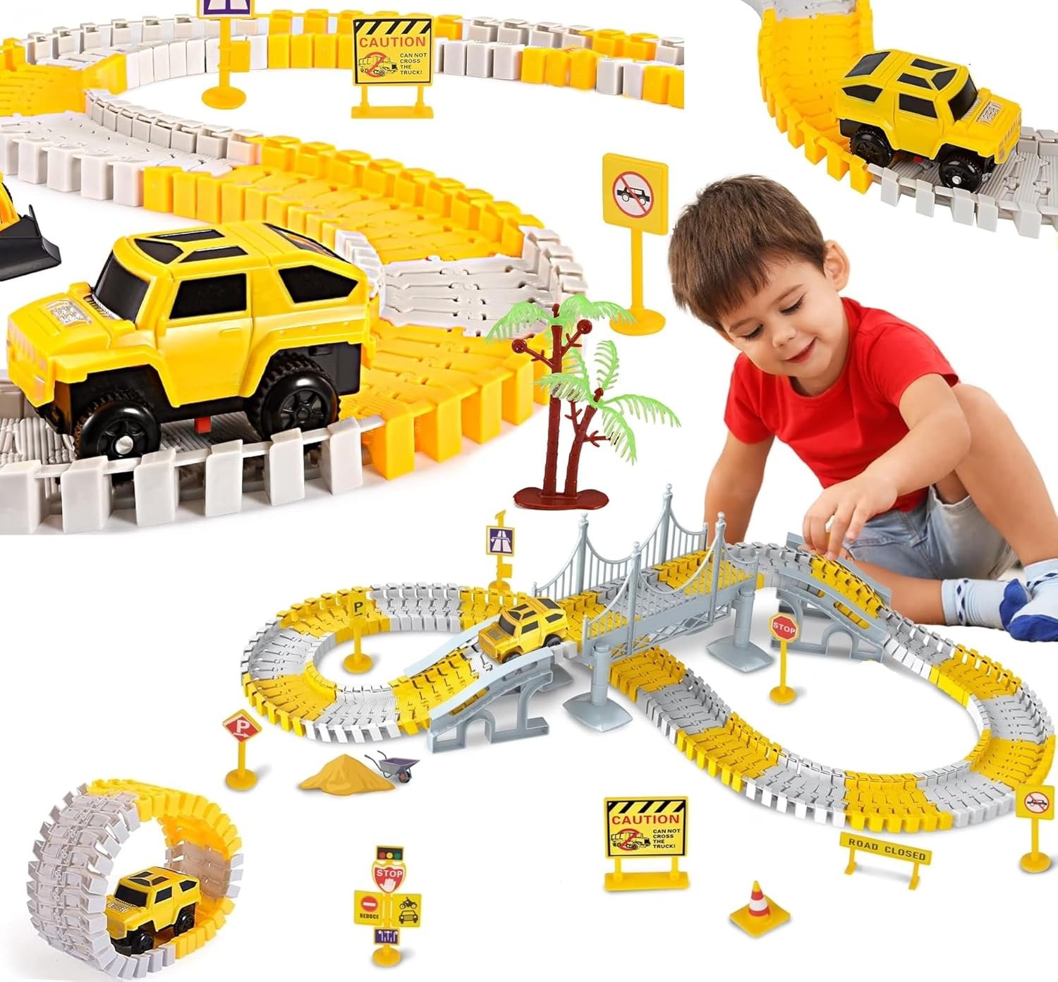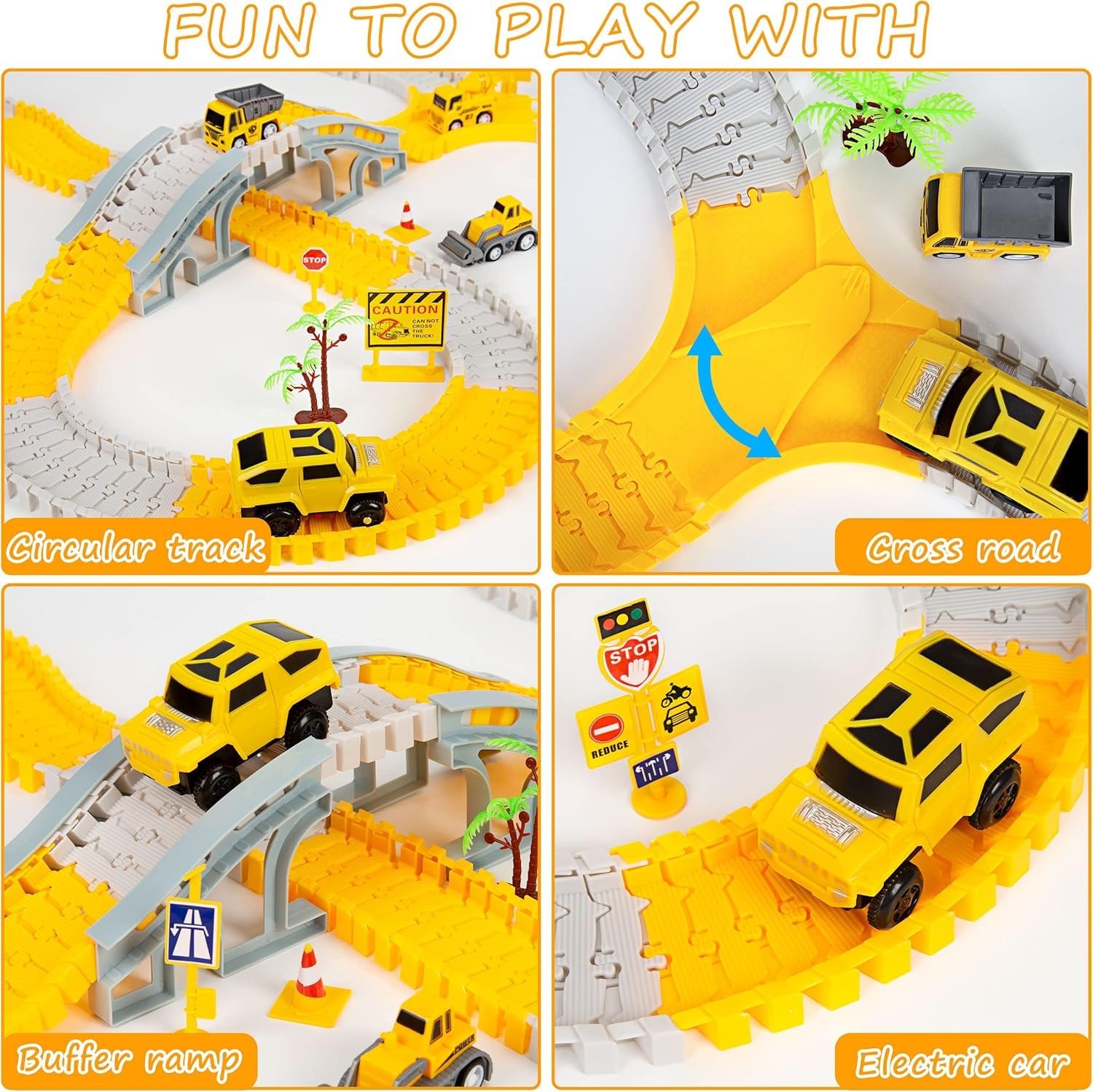 Build Your Construction Zone: This set includes flexible track pieces, 1 electric race car, traffic signs, Y-shaped track, roadblock, trees and more, everything needed to create a lively construction site. Kids can engage in hands-on play and imaginative building adventures while exploring the exciting world of engineering.
