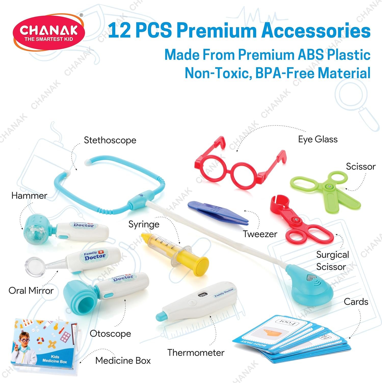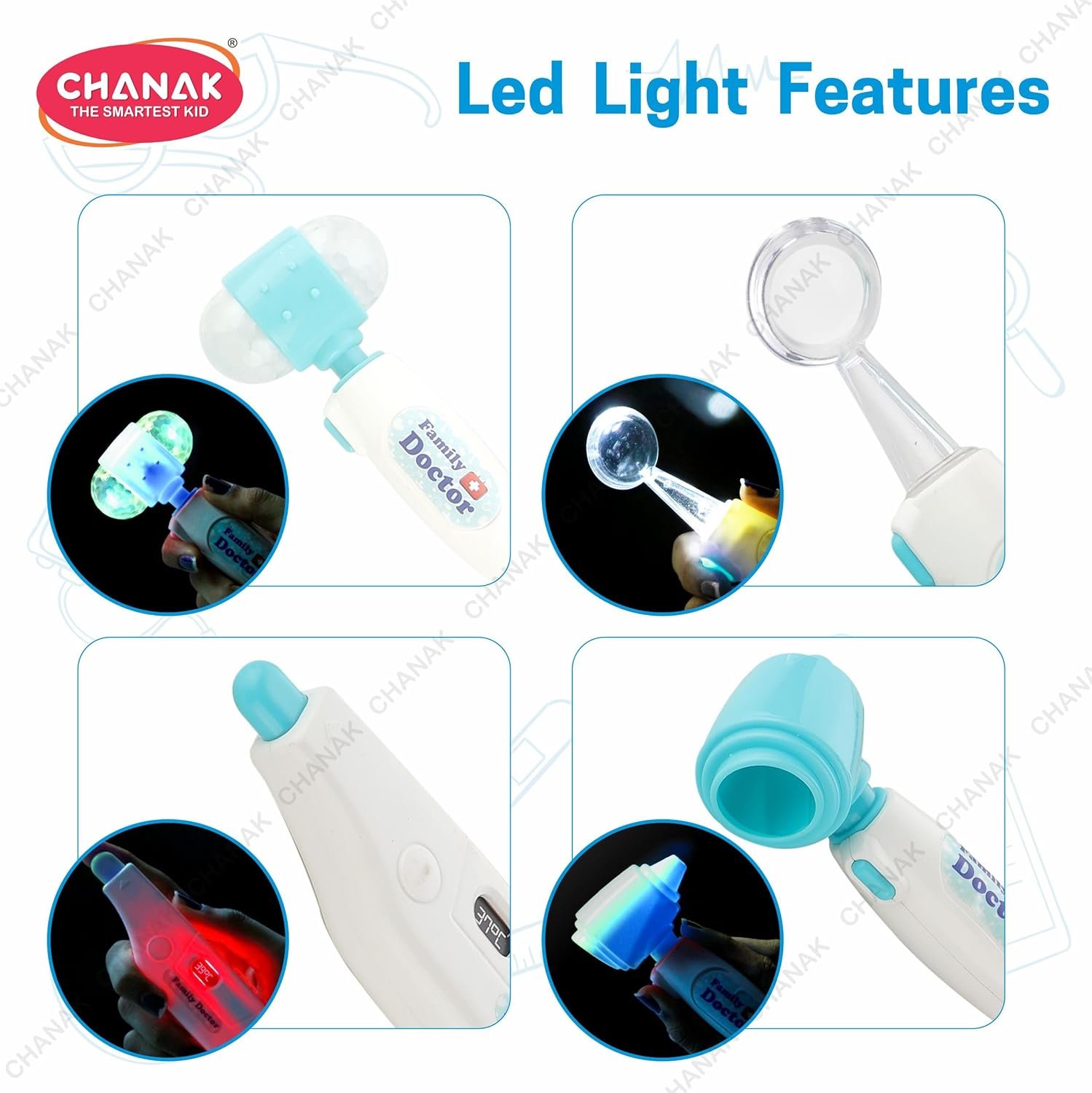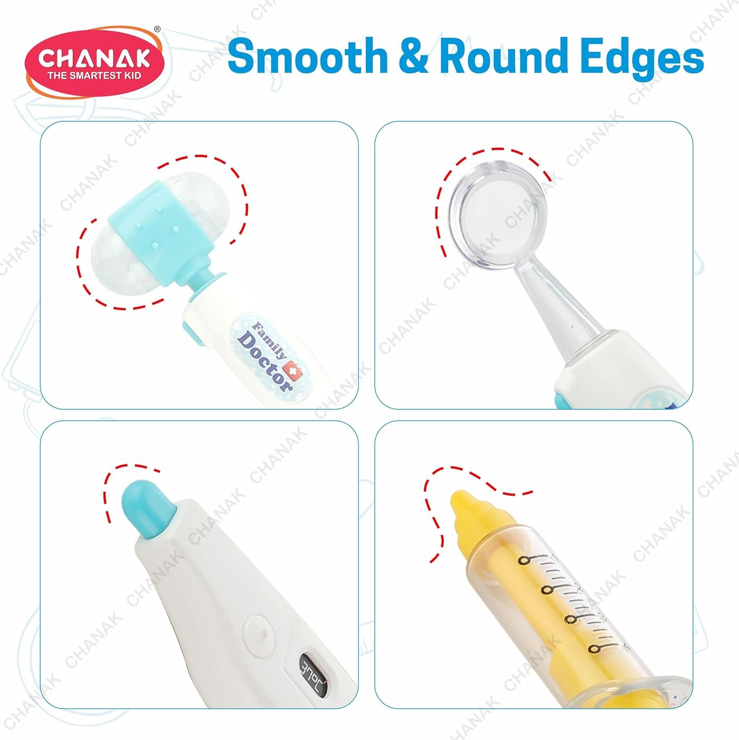 2) Innovative Stethoscope: Chanak’s Doctor Set contains a brand-new and unique stethoscope. It makes the sound of a heartbeat when pressed against the body. It comes with an attractive LED light along with a heartbeat sound. These unique features will make our doctor set your child’s favorite playtime toy.