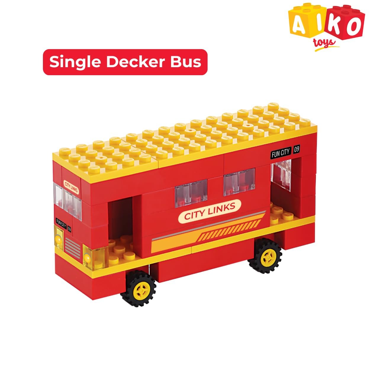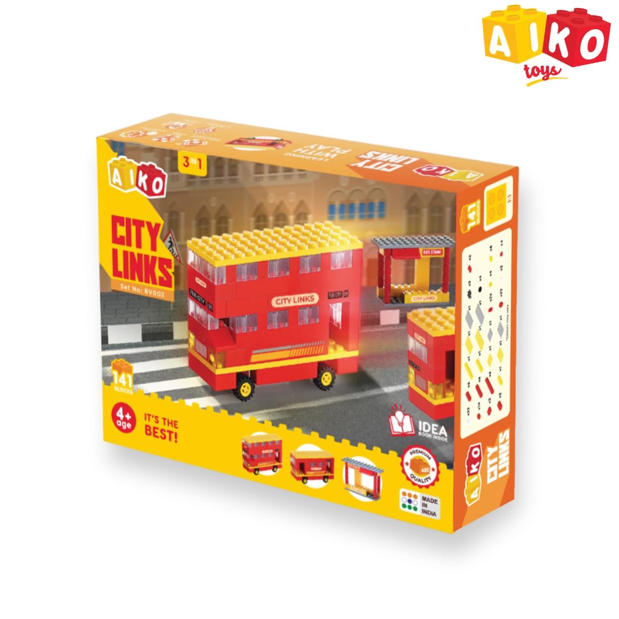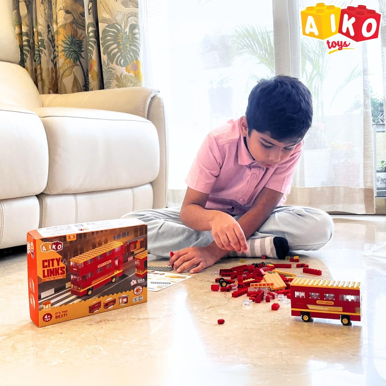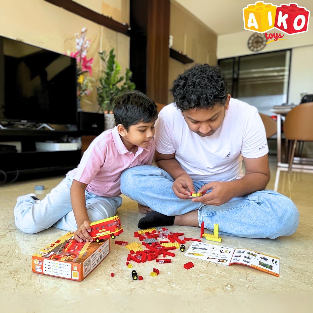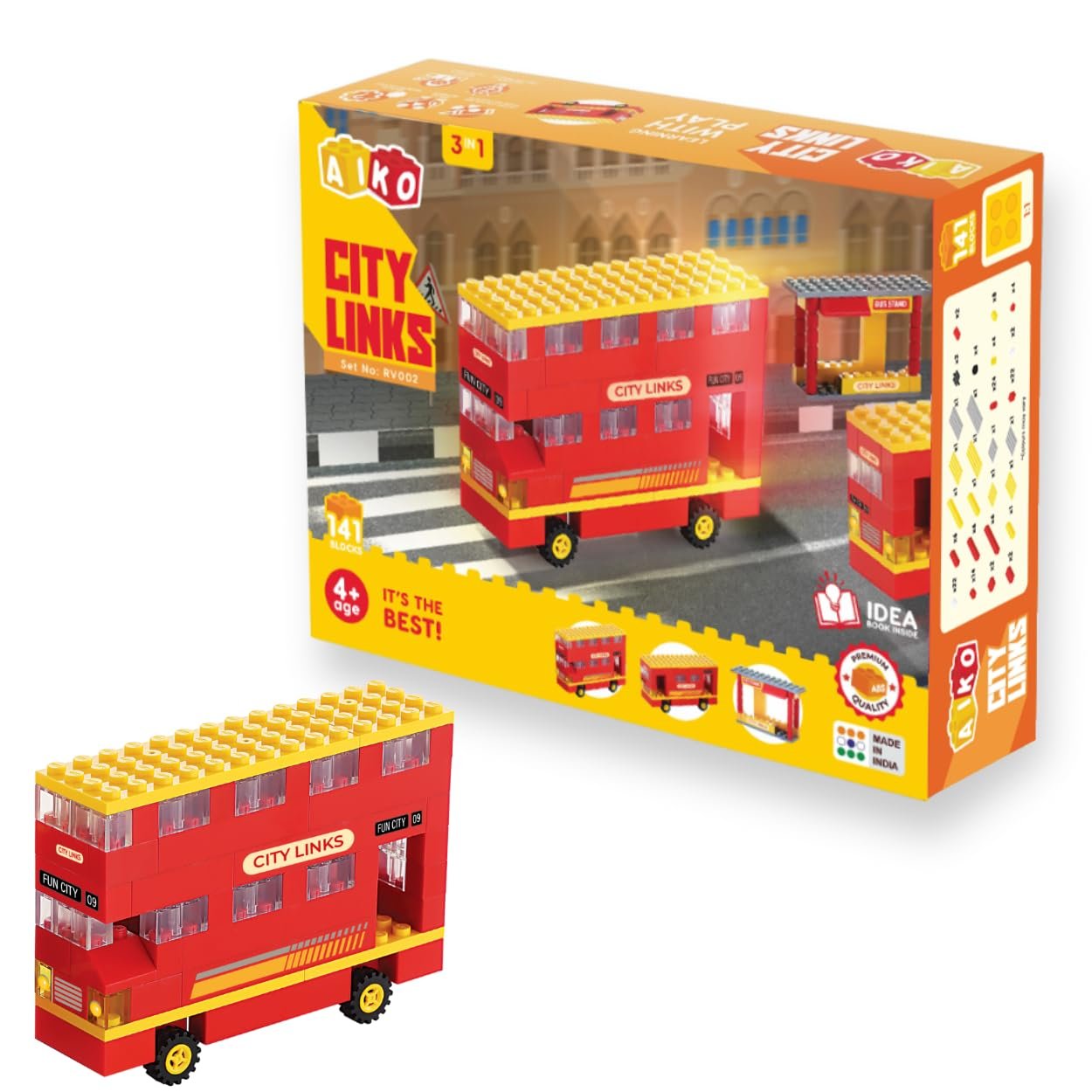 141-Piece Colourful Building Set – Features high-quality ABS plastic blocks for constructing a bus, double-decker bus, bus stand, and city structures, sparking creativity.