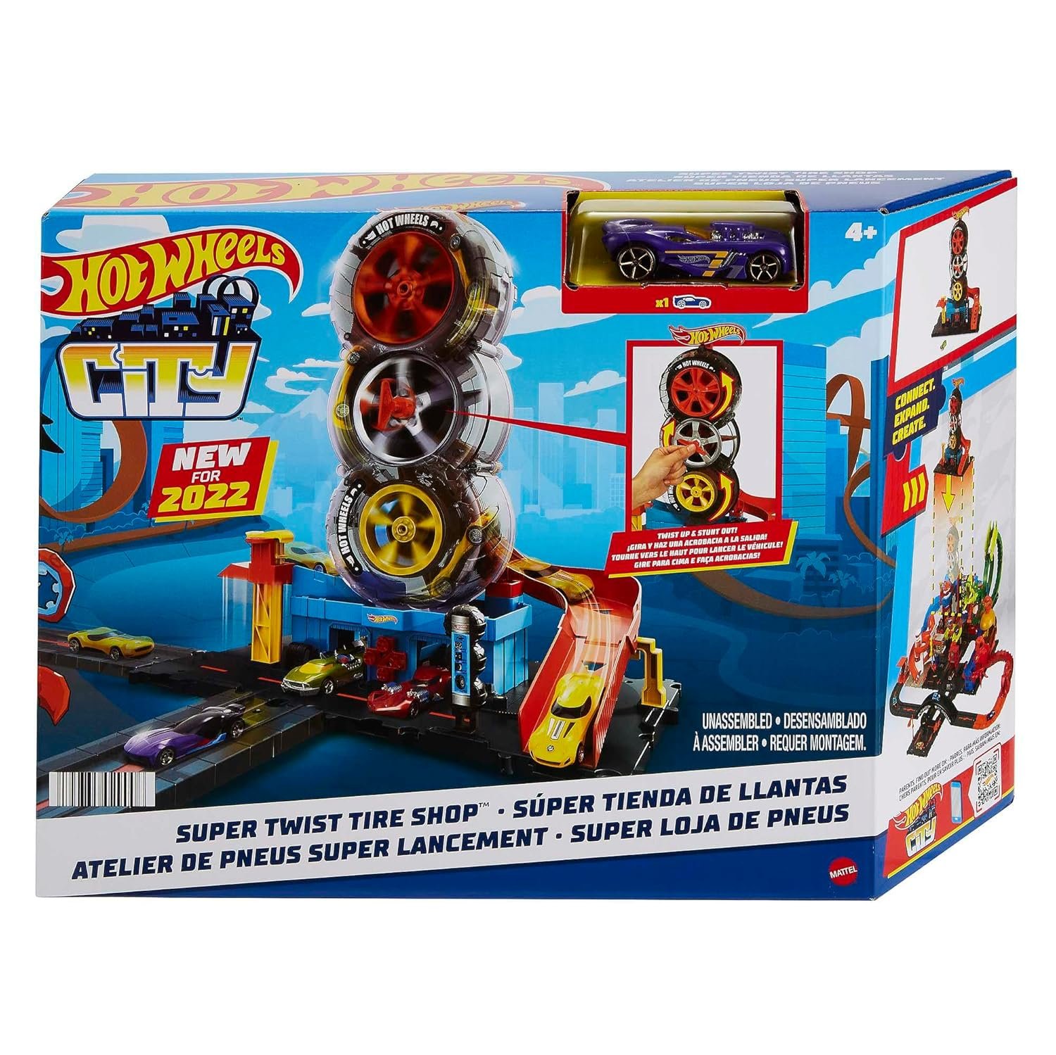 Kids tackle multiple twists and turns in the ™ City Super Twist Tire Shop™ as they spin the center key and move their cars through the translucent wheels of the shop. Once they reach the top, they stunt down the ramp, off to new adventures. The base of the playset connects to other ® sets and can be used with additional ® track pieces so that kids can build out a stunting and racing world of their own design (additional sets and track sold separately). One ® car is included, but up to four can twist through the tire structure at once (additional cars sold separately). Realistic details like a kid-activated lift, spinning tire display and gas pump enhance the storytelling possibilities. Colors and decorations may vary.