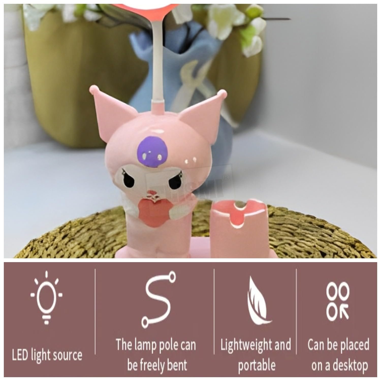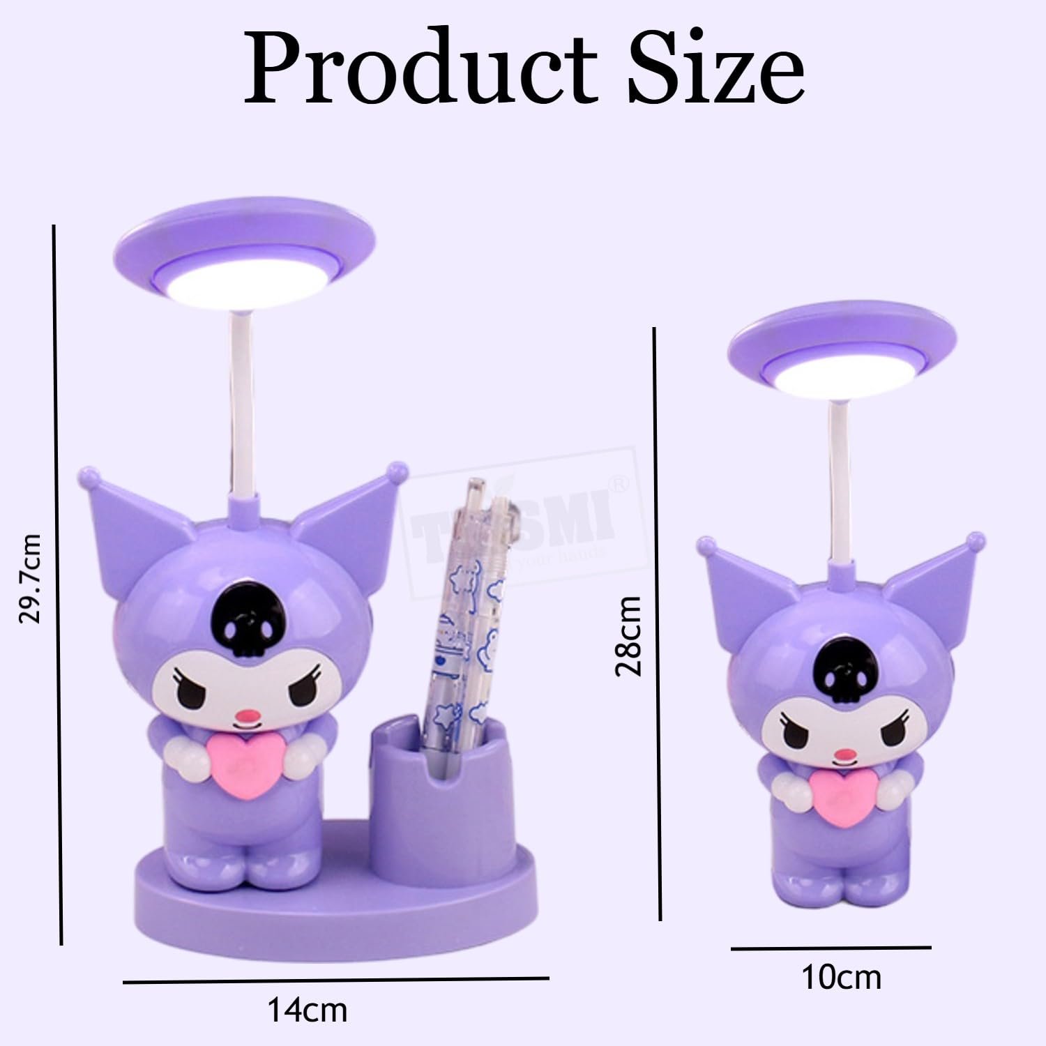 Brighten up your study time with the TLISMI Cute Kuromi Cartoon Design Rechargeable LED Table Lamp, a perfect blend of functionality and style for kids and teens. Designed with an adorable Kuromi-inspired character, this lamp not only lights up your desk but also adds a touch of fun and charm to any room décor. Whether it’s for study, reading, or bedtime, this cute desk light is sure to be your child’s favorite companion. Crafted from durable ABS material, the lamp is strong, drop-resistant, and long-lasting, making it perfect for daily use. The 360° flexible gooseneck allows you to adjust the light angle with ease, ensuring the right amount of brightness exactly where it’s needed. The soft, flicker-free LED light is specially designed to protect young eyes from strain, providing safe and comfortable illumination for hours of study or relaxation. This multifunctional lamp also doubles as a handy desk organizer. It features a built-in pen holder to neatly store stationery and an inbuilt sharpener, keeping all essentials within easy reach. The rechargeable battery with USB charging makes it portable and convenient, so kids can use it on study tables, bedside stands, or even carry it while traveling. With its cute design, practical features, and safe lighting, the TLISMI Kuromi Cartoon Table Lamp makes an ideal gift for boys and girls. Whether for birthdays, festive occasions, or simply as a thoughtful study accessory, this lamp is sure to delight and inspire kids while keeping their desk tidy and well-lit.