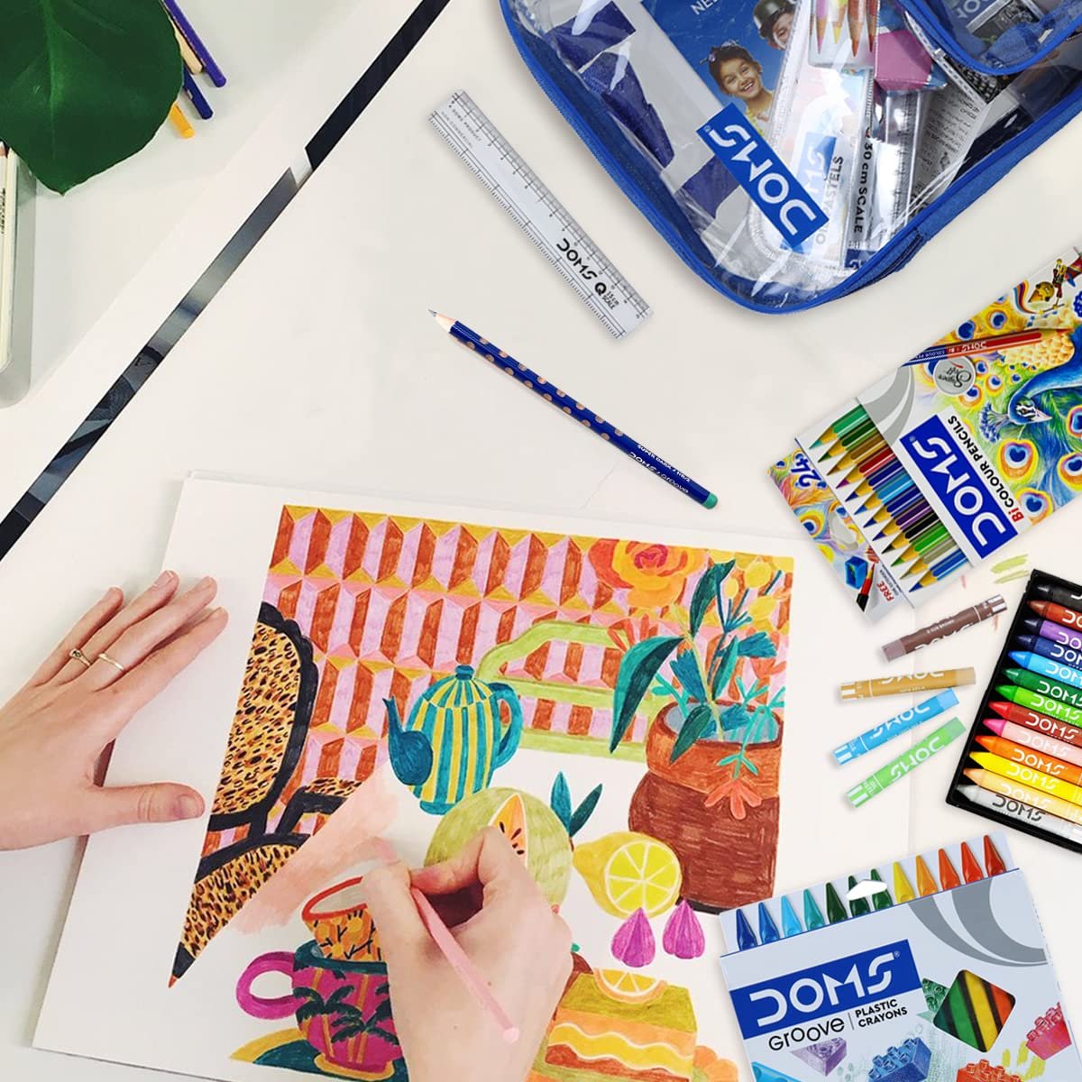 Product : 1 Groove Triangle Pencil, 1 Drawing Book, 1 Mini Water Colour Pen, 25 Oil Pastels, 12 Aqua Water Colour Pencil, 12 Jumbo Crayons, 1 Q 30 cm Scale, 14 Plastic Crayons, 1 Hexagon Eraser, 1 Car Eraser, 1 Chalk Holder & 1 Coloured Chalk | Combination of 12 Stati1ry Items
