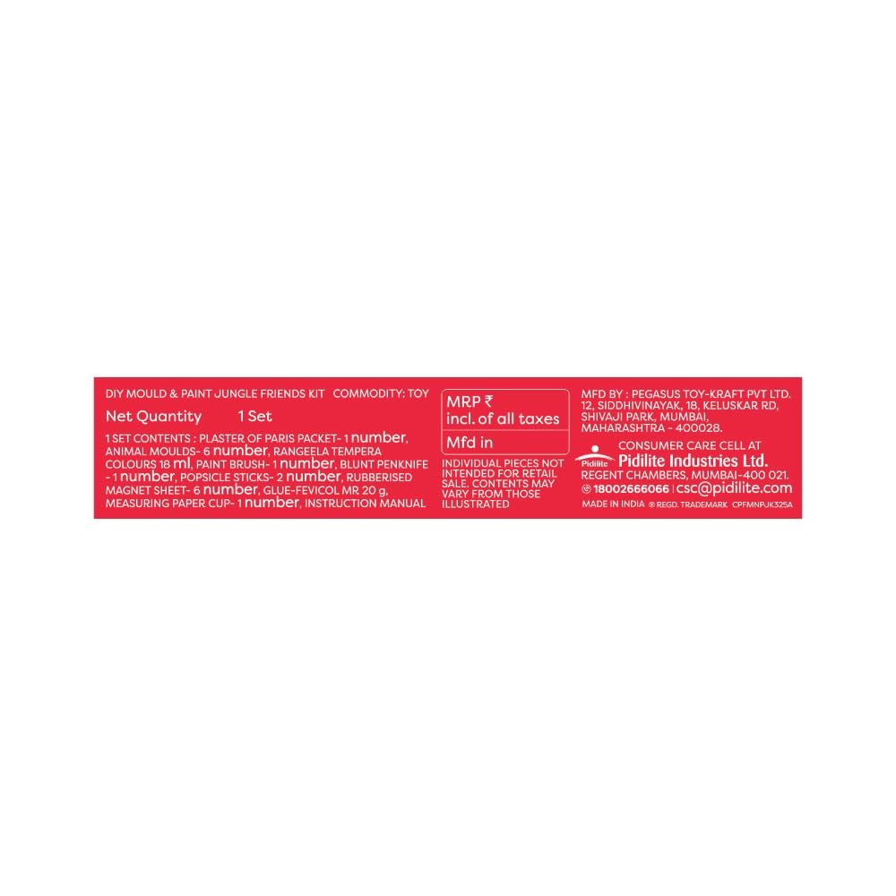 This DIY paint and craft kit contains a blunt penknife, animal molds, a rubberised magnet sheet, a measuring cup, Fevicol, Plaster of Paris packet and much more.