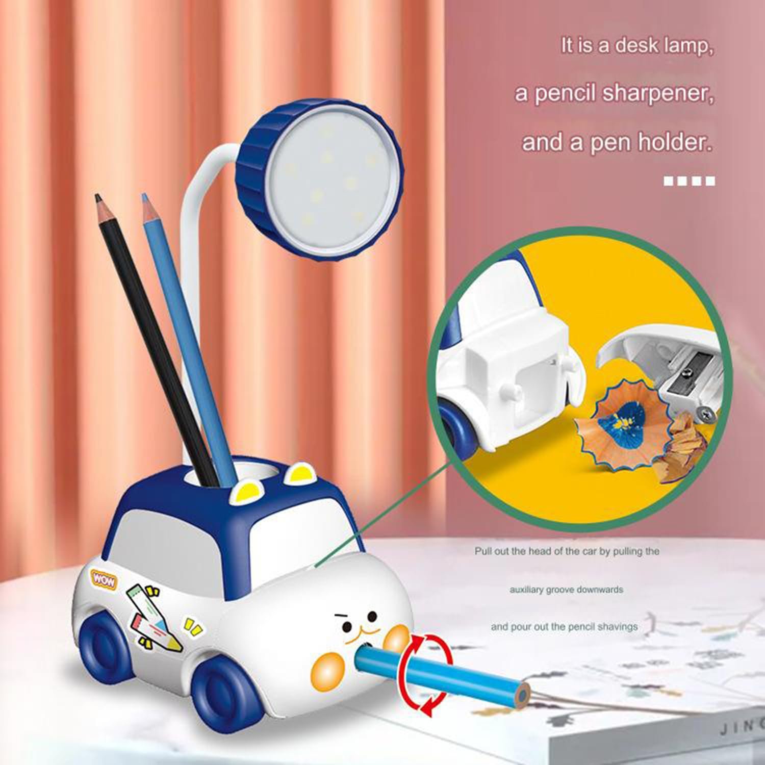 Flenzy Plastic Car Pencil Sharpener Table Desk Lamp with Pen Holder, Blue, Pack of 1
