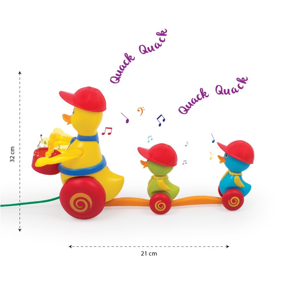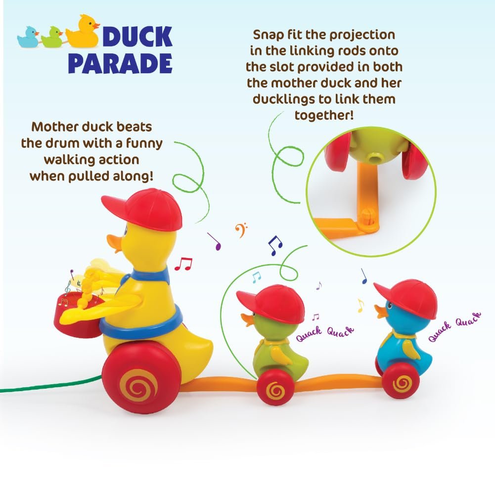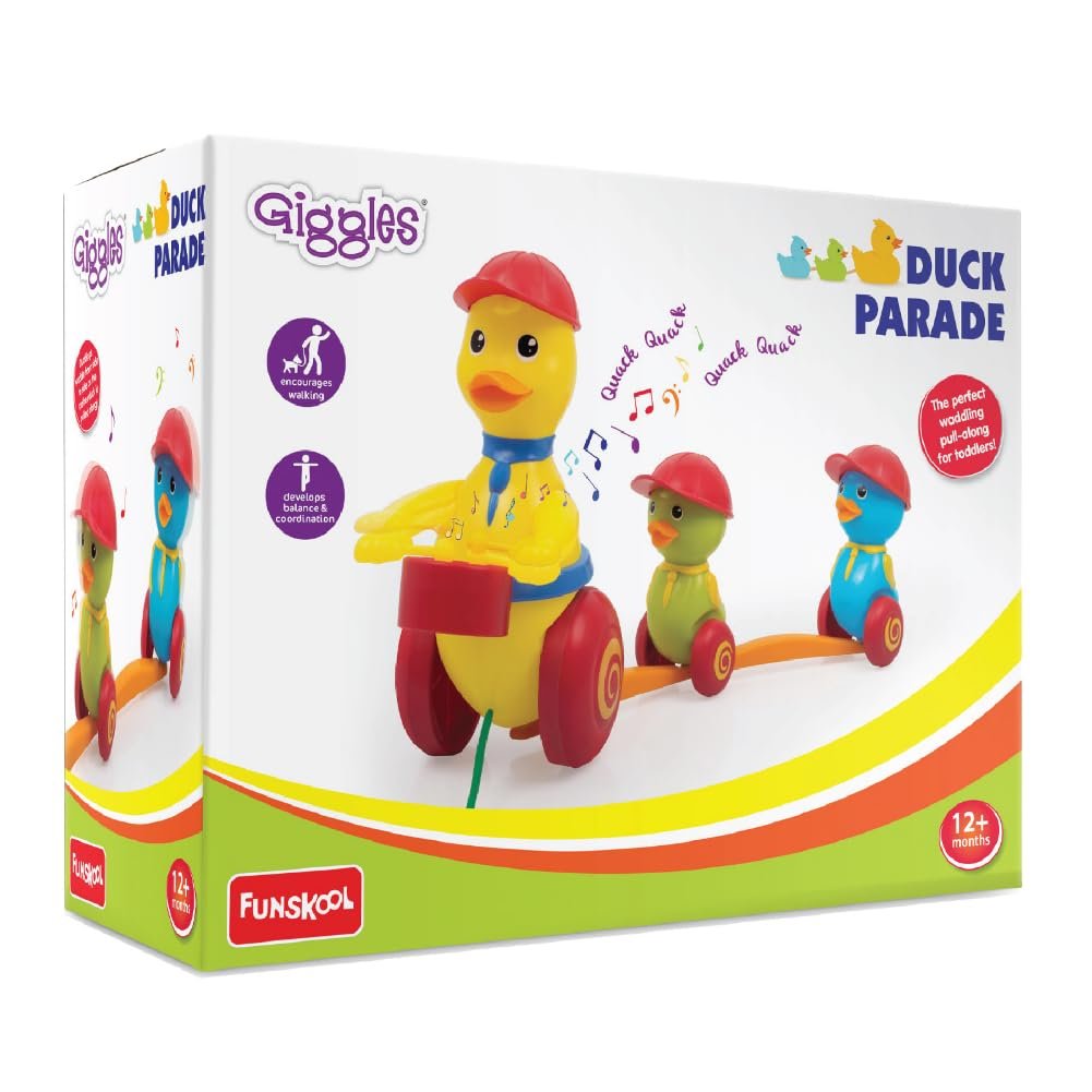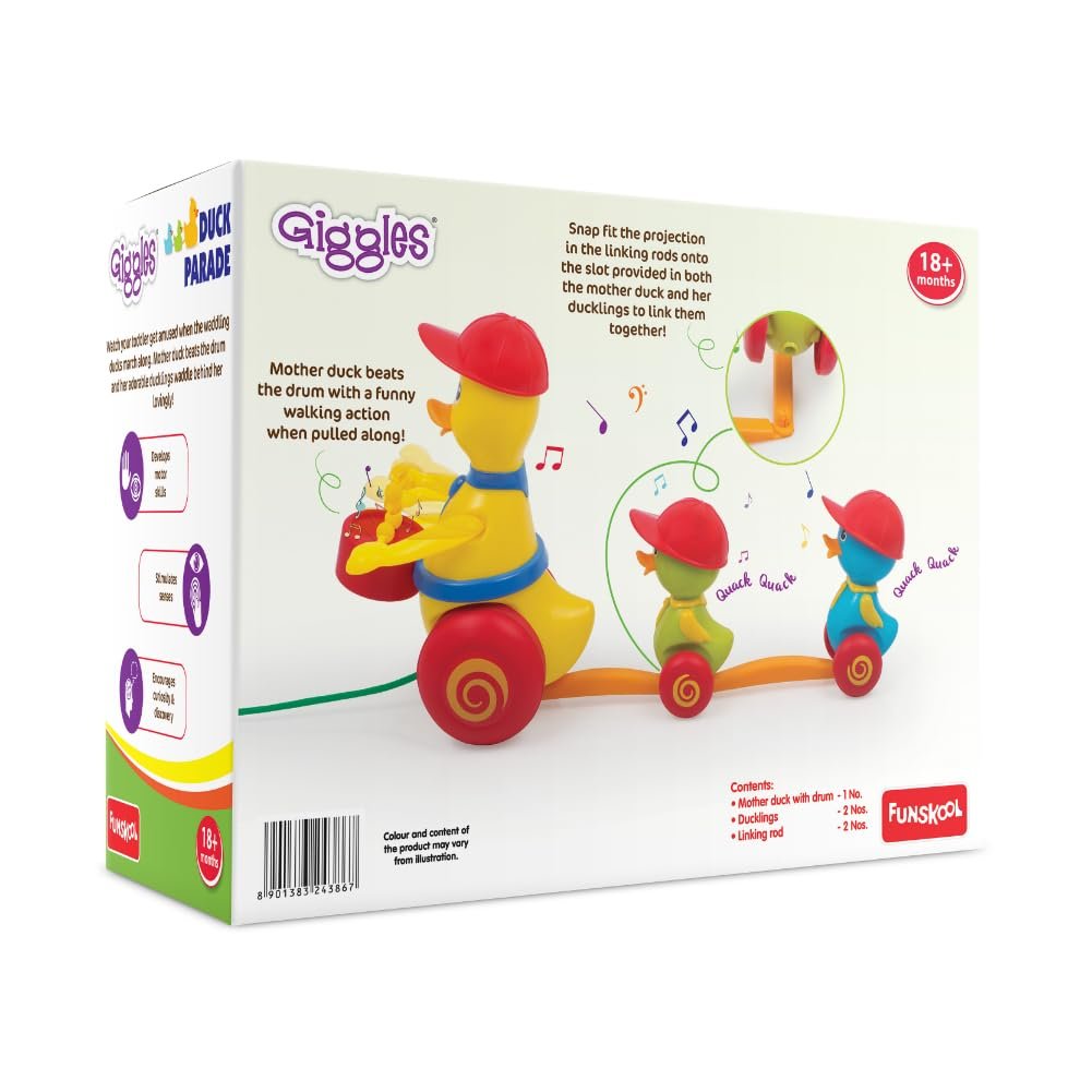 Funskool giggles duck parade is an amusing and entertaining pull-along toy, which has a drum beating mother duck followed by her waddling two cute ducklings