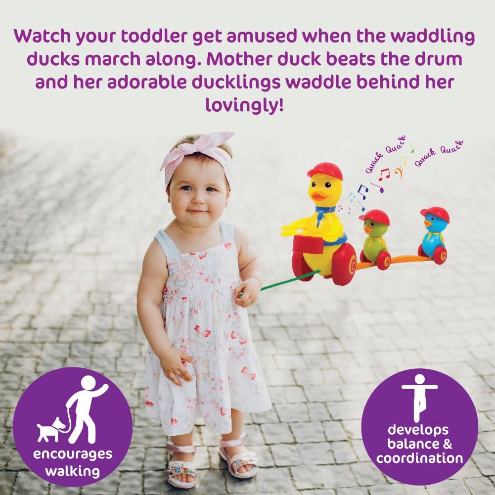 1 mother duck with drum, 2 ducklings, 2 linking rod – make for a perfect and best waddling pull-along toy for toddlers