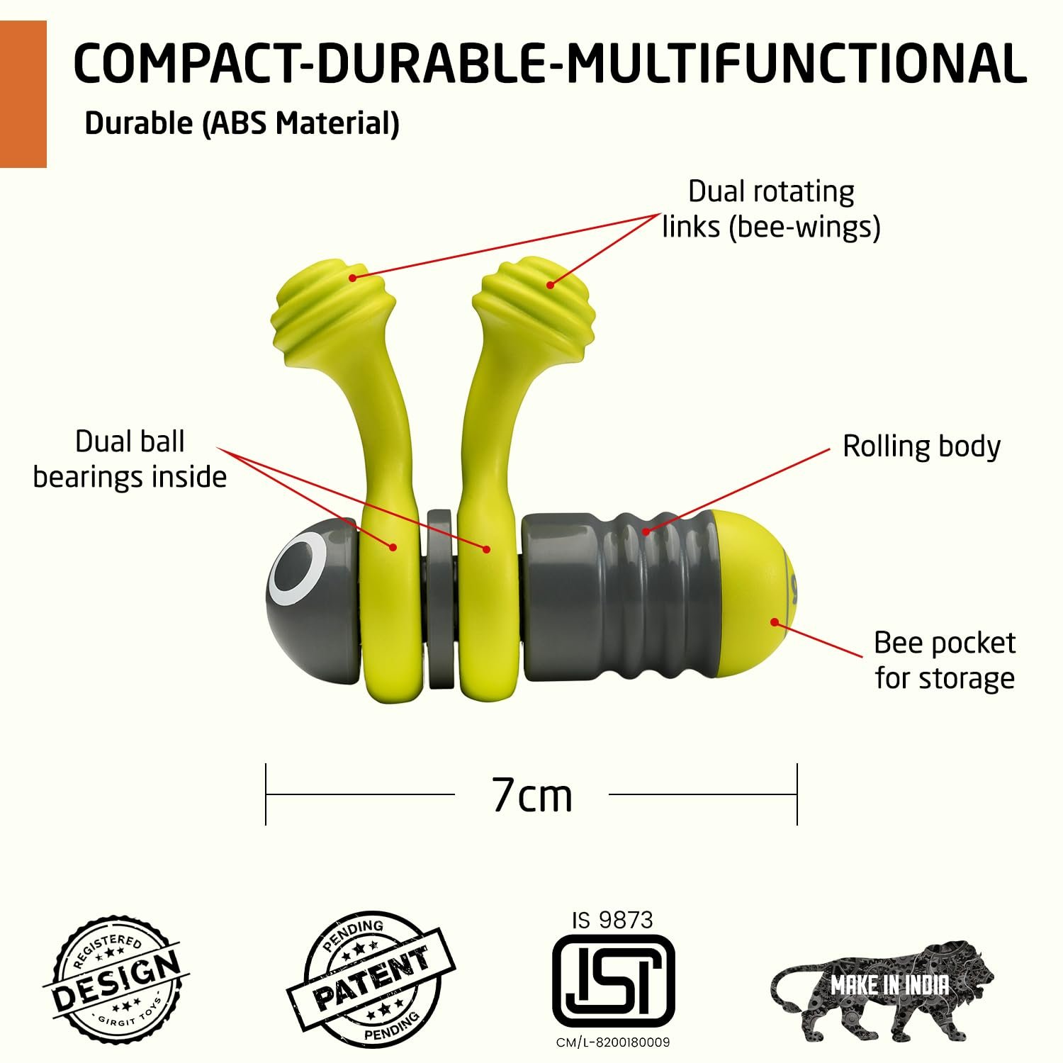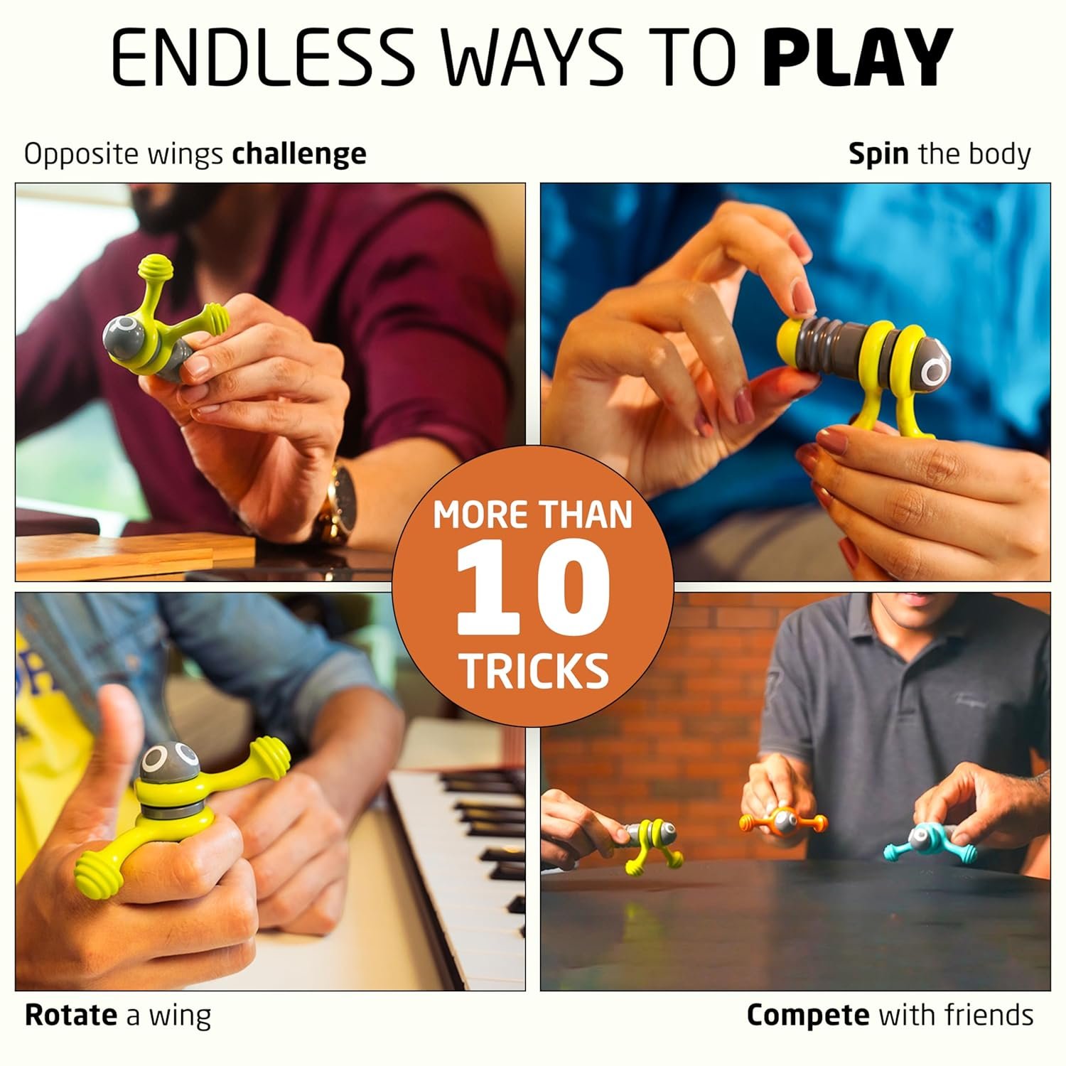HOW TO PLAY : RotoBee is a multi-link Fidget + Skill gadget you master with practice. Try these fun challenges: spin both wings in opposite directions (sounds simple, but it takes patience, the right hand movement, and practice to master). Rotate one wing while keeping the other constant. Likewise, explore countless unique tricks (watch videos). Challenge friends, family, and enjoy endless fun.