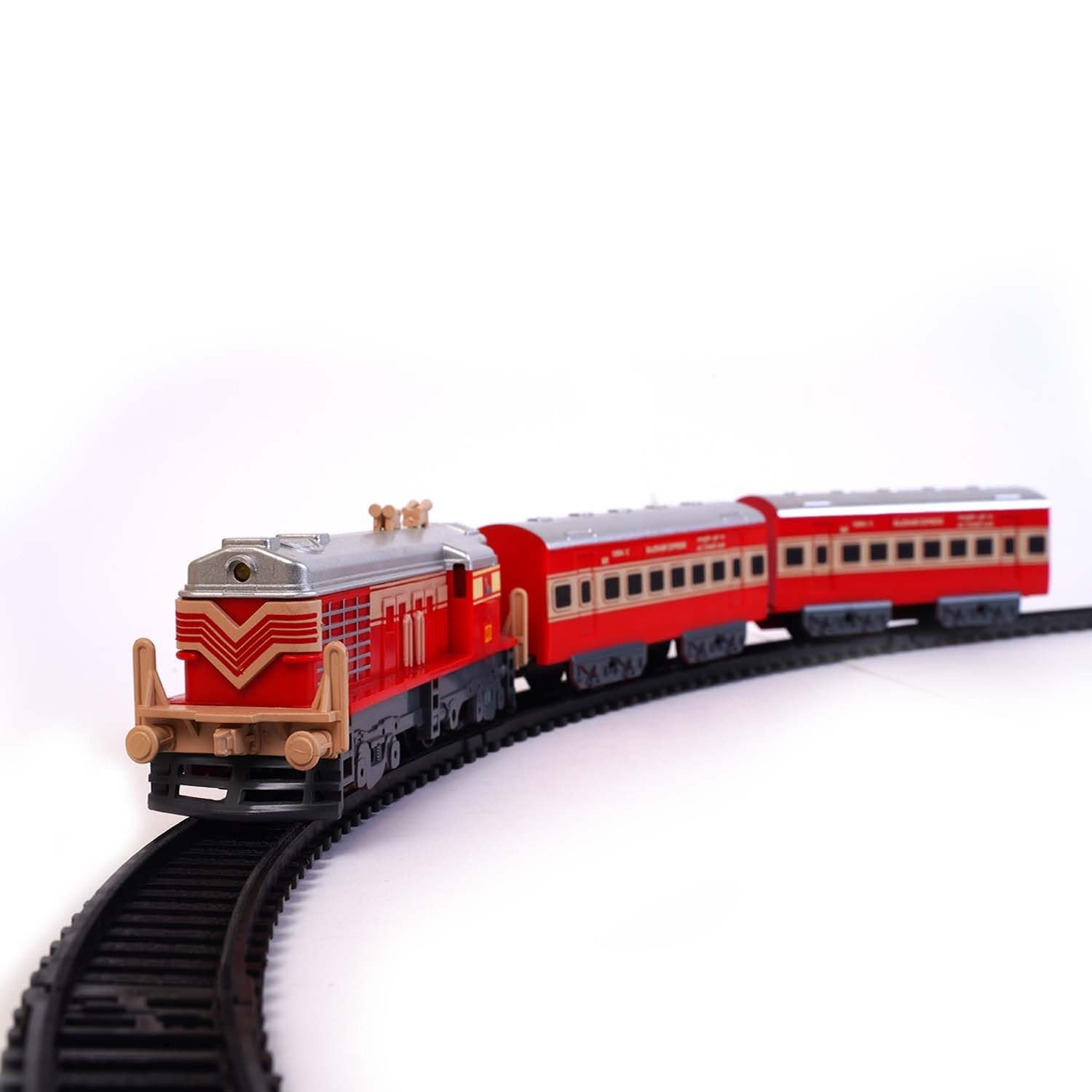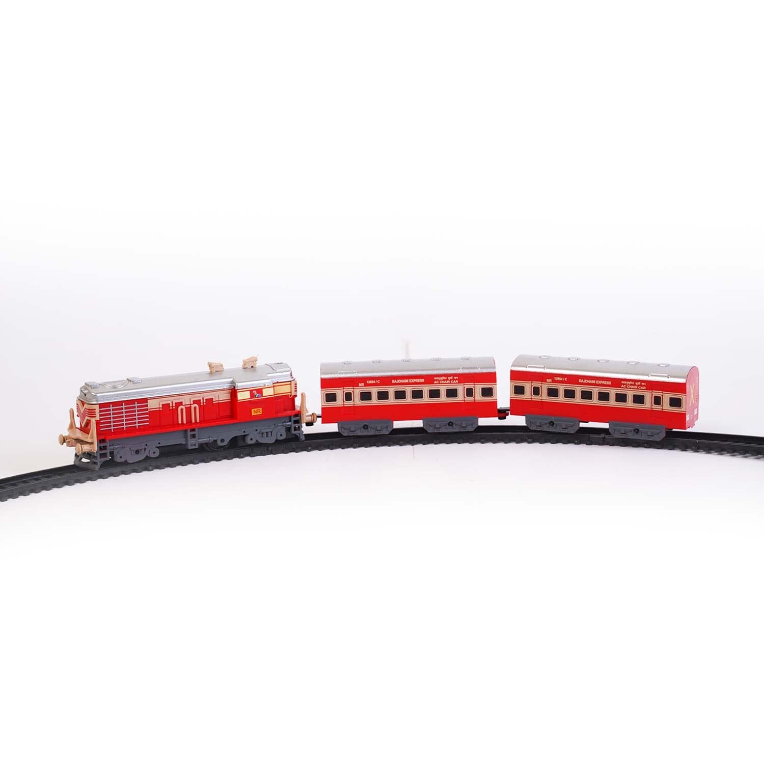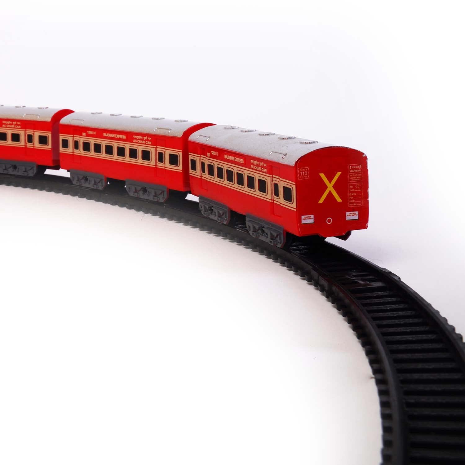 Contents: Battery Operated Toy Train Set Contains – 13 Pieces in total including, 1 Train Engine, 2Train Coaches & 10 track pieces