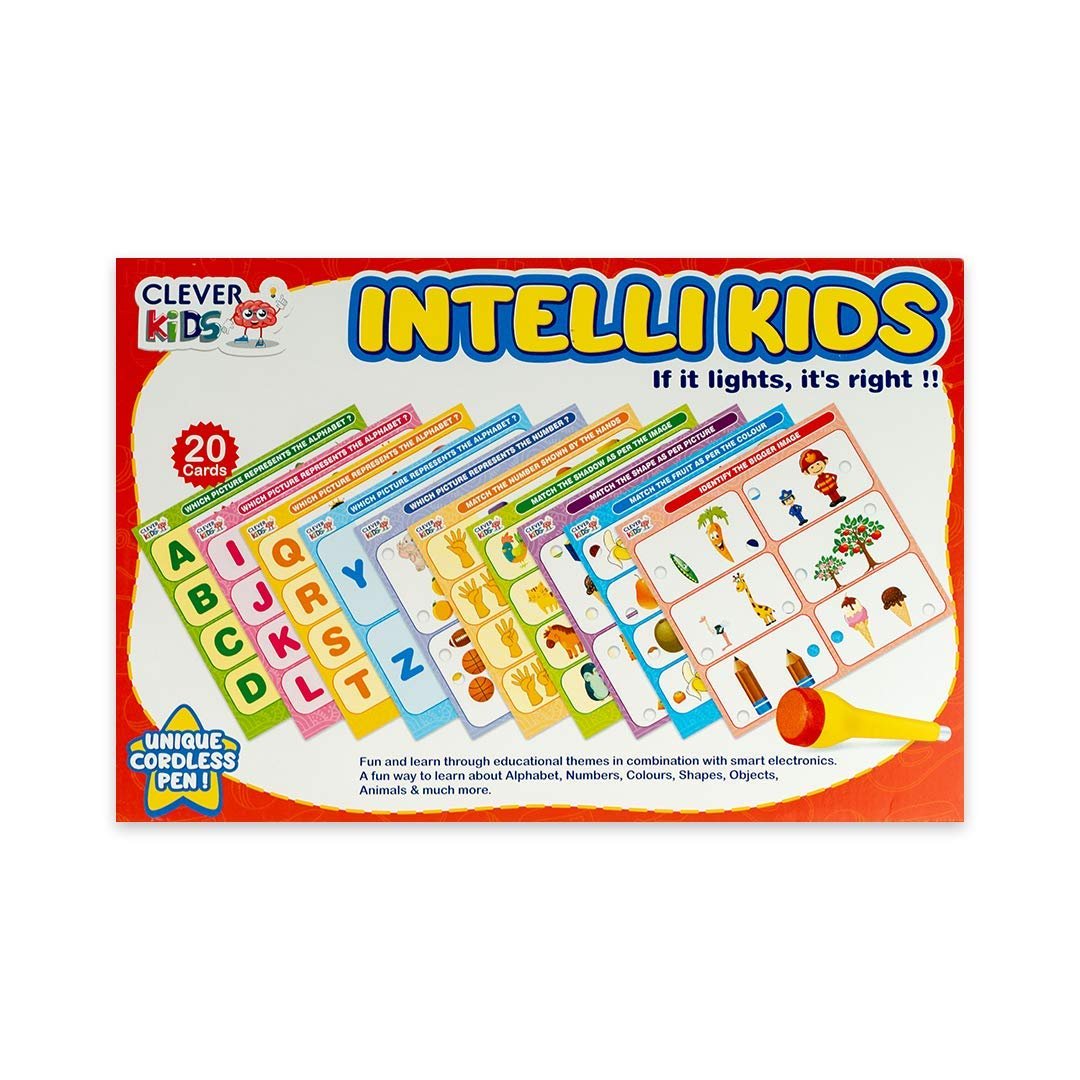 If it is right, it lights!  Clever Kids present Intelli Kids – an innovative and interactive learning game set, power-packed with a unique cordless pen. The Pen lights up every time your child taps a correct answer on the sheet. Intelli Kids – Alphabet and Numbers theme is an interactive game set for kids aged 2 years and above that requires parents’ support strengthening the bond and early learning discipline. Once kids get used to it, they can themselves recognize if the answer is right or not! It resembles the iconic bulb-glow of creativity and your kid’s first step towards a creative journey. Intelli Kids is devised specially to enhance early learning and help kids remember alphabets & numbers and associated words, counting and definitions for long. All in all, Intelli Kids is a pre-school game set that will make your little munchkin look forward to learning and glowing answers! Reliable material and sturdy mechanism The baseplate material is sturdy and long-lasting, absorbing shocks and heavy strokes by the pen. The sheets are stain-resistant and easy to clean. The sheet surface is glossy and hard against scratches. The cordless pen comes with replaceable cells which are easy to install. Pen material is non-toxic and safe. Easy battery replacement ensures the activity can be used again and again and over and function just as the first time. Unique cordless lighting pen 20 Cards/Sheets – alphabets and numbers theme Baseplate High-quality material Age – 2 years and above Sturdy Mechanism Made in India – Swadeshi product