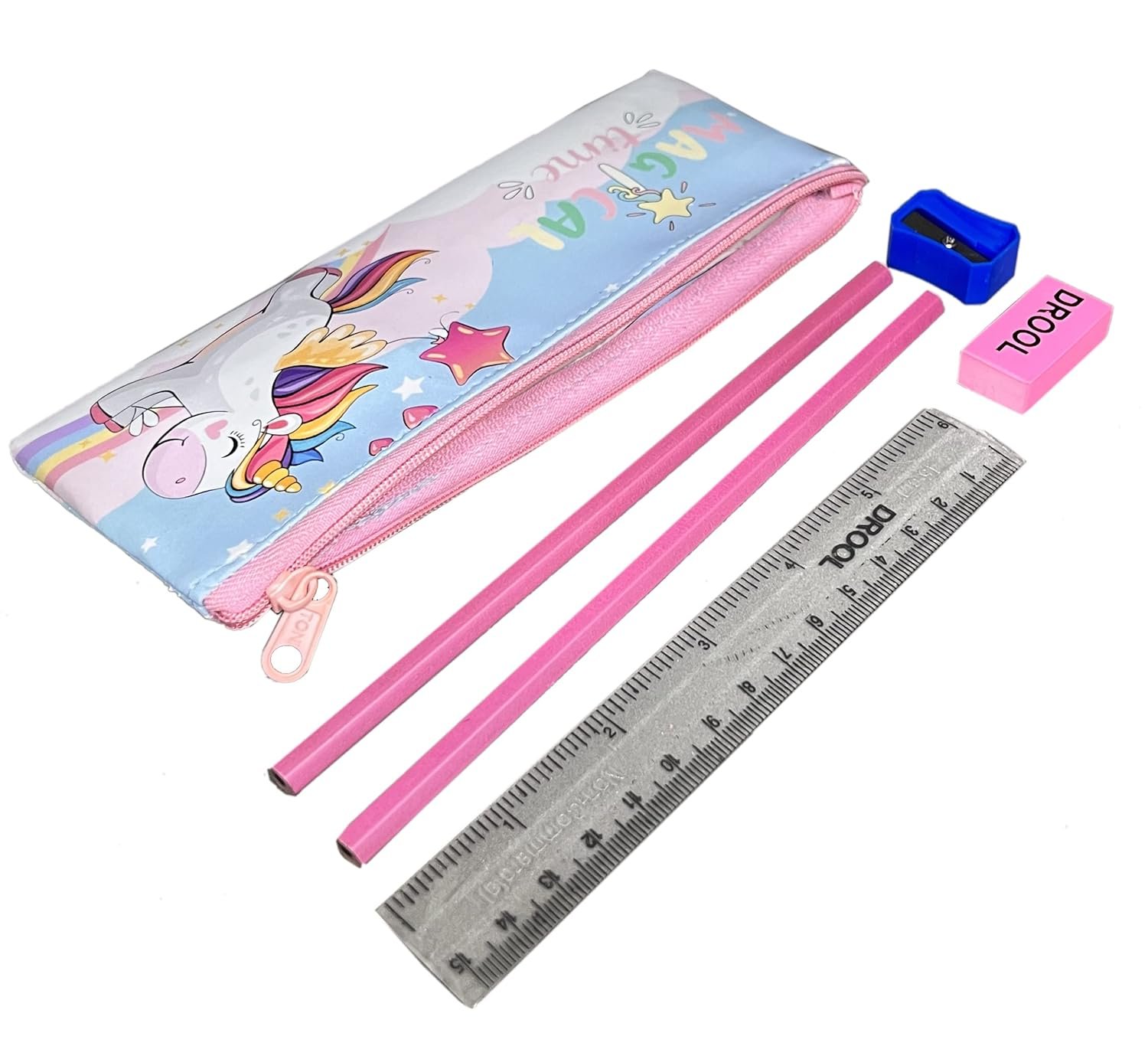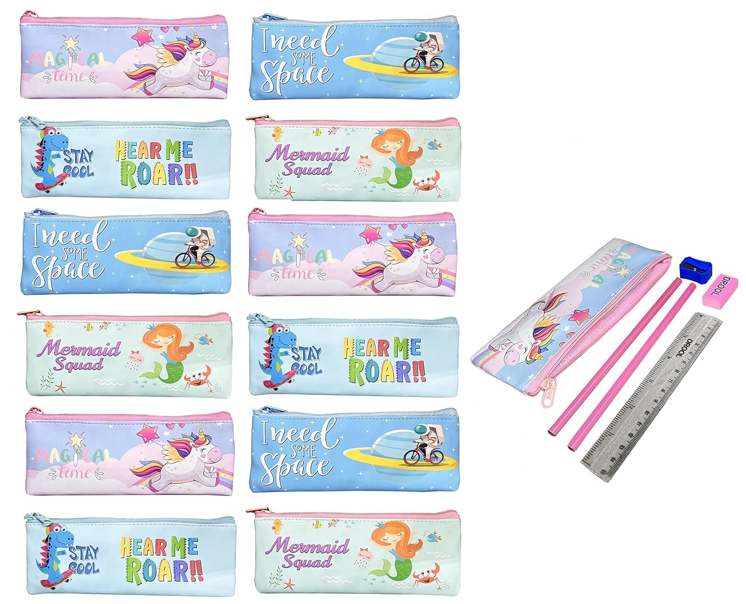 Set Of 12 Pouch Stationery Pack – Each Pack includes Fancy Pouch, 2 Pencils, 1 Ruler, 1 Eraser and 1 Sharpener