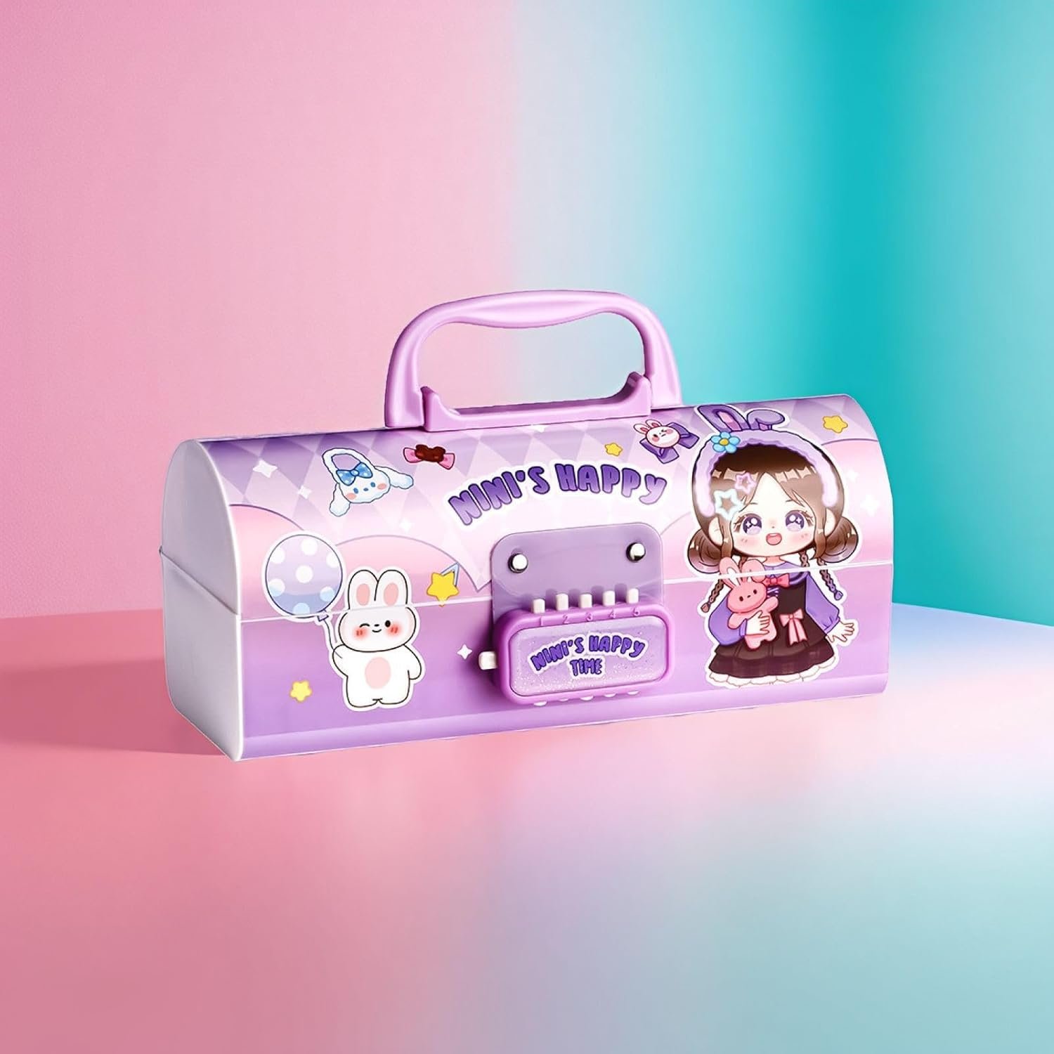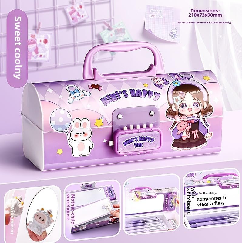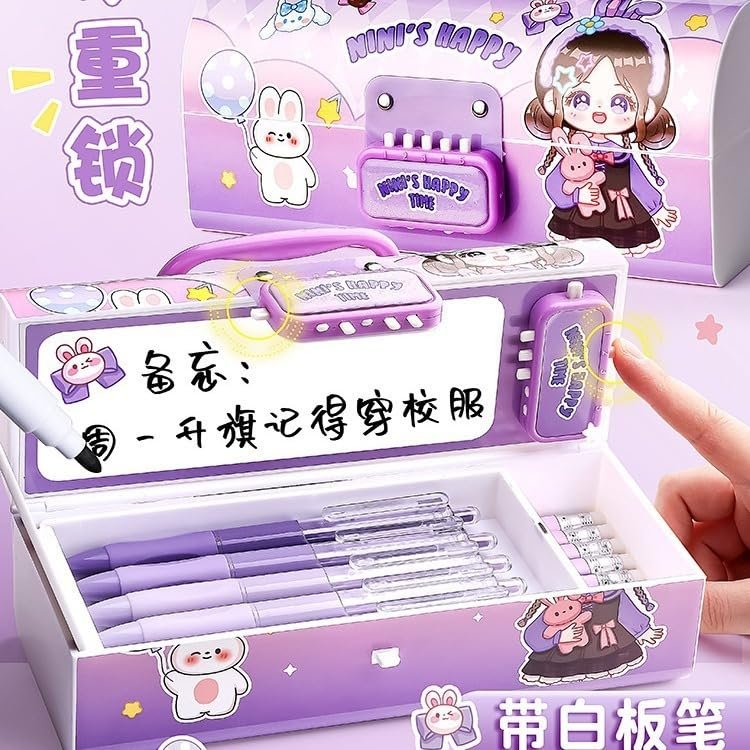 Features: Password lock features with double layer compartments, each one to pop out double layer box with wheels, eraser compartment, additional compartment and pencil/pen holder.