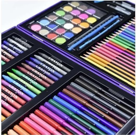 COMPLETE ART SET: 128-piece comprehensive art supplies including watercolours, oil pastels, and coloured pencils in an organised carrying case