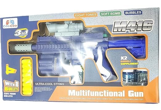 Multi Functional 3in1 Battery operated M416 rifle gun. Can shoot bubbles and soft bullets. Light and sound will add more colour to every play. (Battery not included)