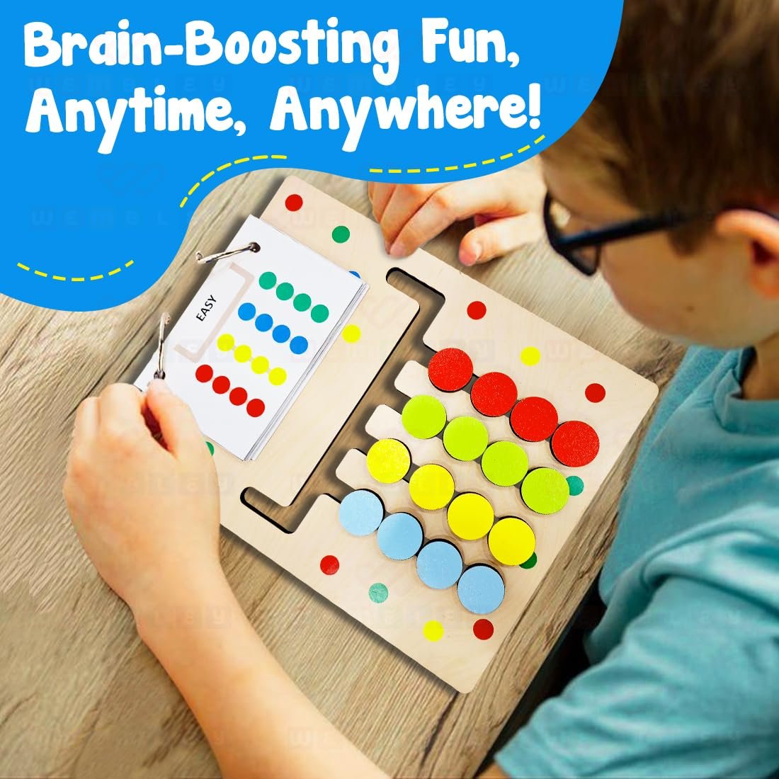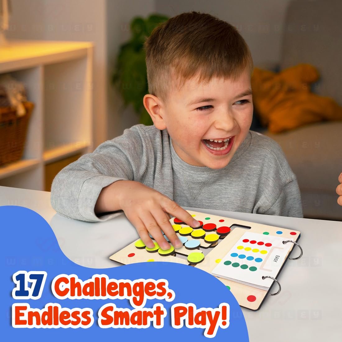 FUN SLIDING PUZZLE GAME: Move the colourful dots to match the patterns shown on 15 challenge cards. This engaging brain teaser toy helps kids develop problem-solving and logical thinking skills while having fun. Perfect for independent play, this puzzle can keep kids entertained while stimulating their minds.