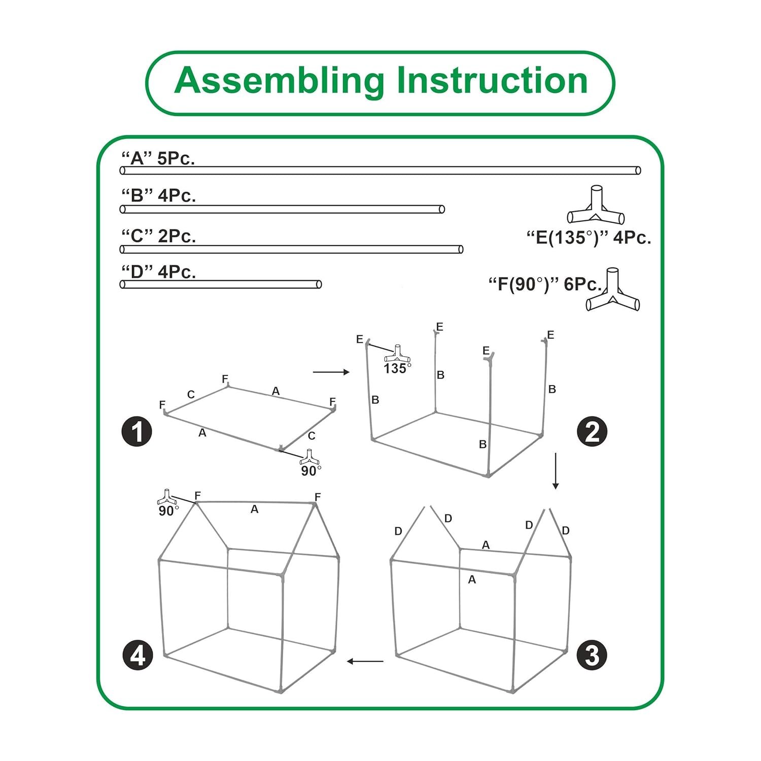 The dimensions of the tent are 91.1 x 68.3 x 104 cm; The box includes a Tent House Cloth, 15 Pipes, and 10 Jointers.