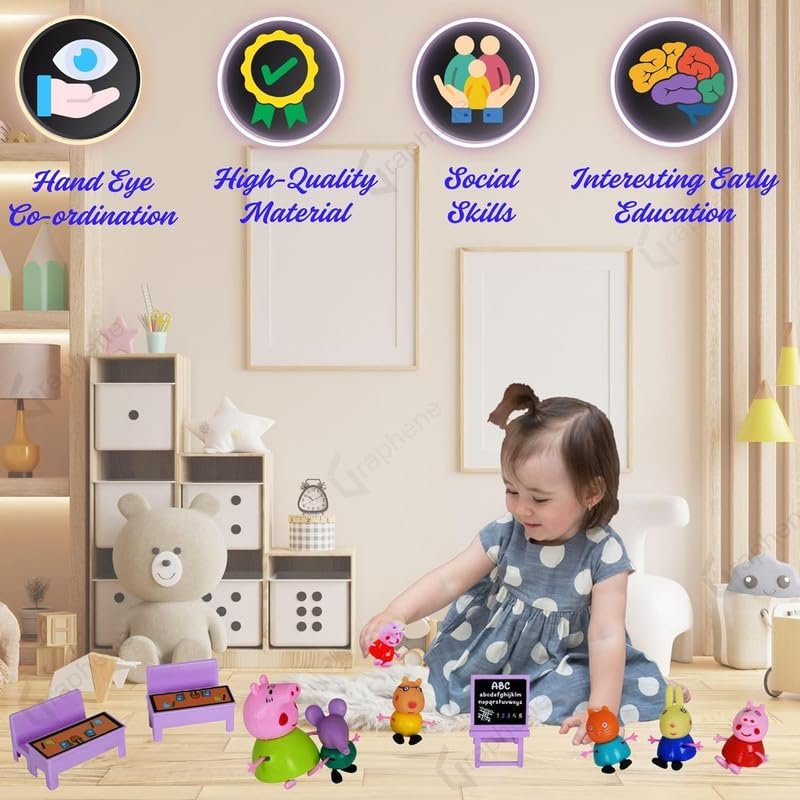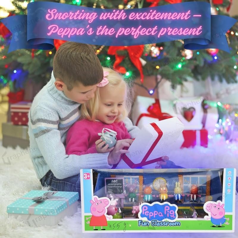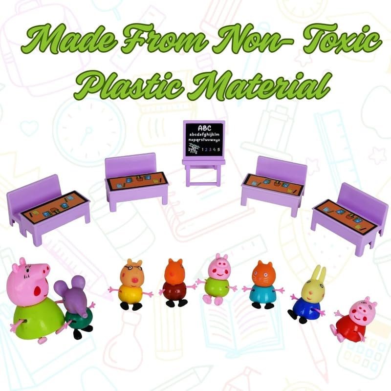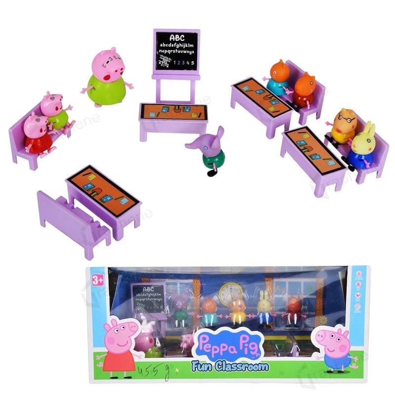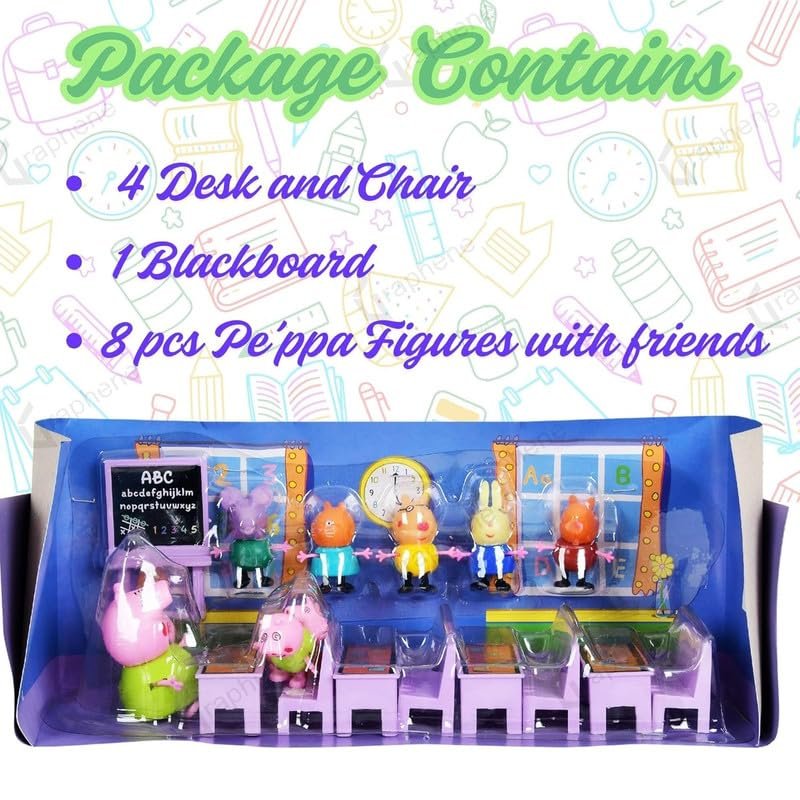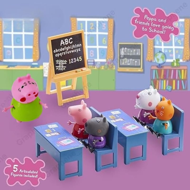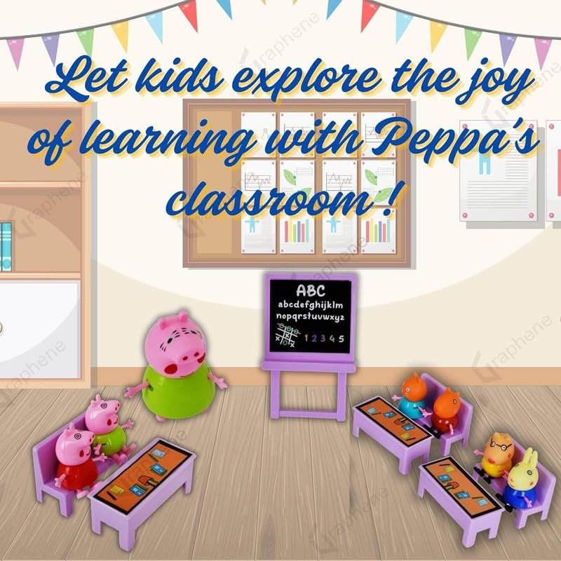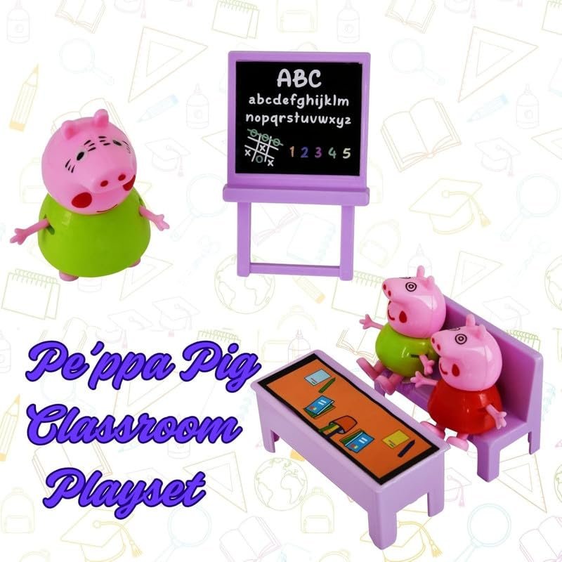 COMPLETE PE’PPA PIG CLASSROOM SET: Includes Peppa Pig family figures, desks, chairs, and a teacher’s blackboard, allowing kids to create realistic classroom scenarios and imaginative school play at home.