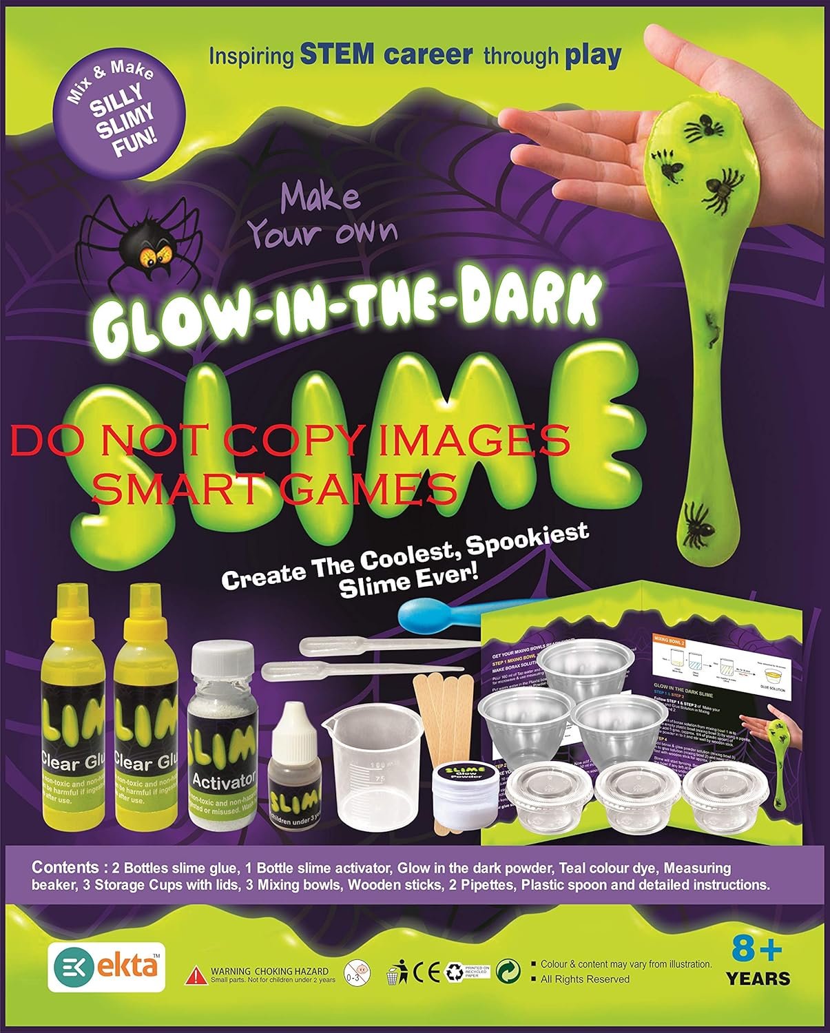 Contents: 2 booties slime glue, 1 bottle slime activator, glow in the dark powder, teal colour dye, measuring beaker, 3 storage cups with lids, 3 mixing bowls, wooden sticks, 2 pipettes, plastic spoon and detailed instructions