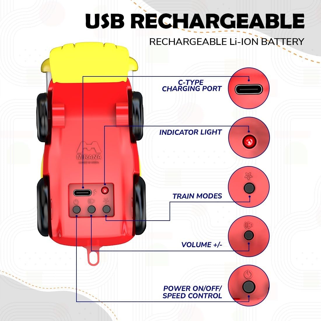 USB Rechargeable Type-C for Convenience: No more worrying about batteries! The train is USB RECHARGEABLE using a Type-C cable, ensuring quick charging and long-lasting playtime without interruptions.