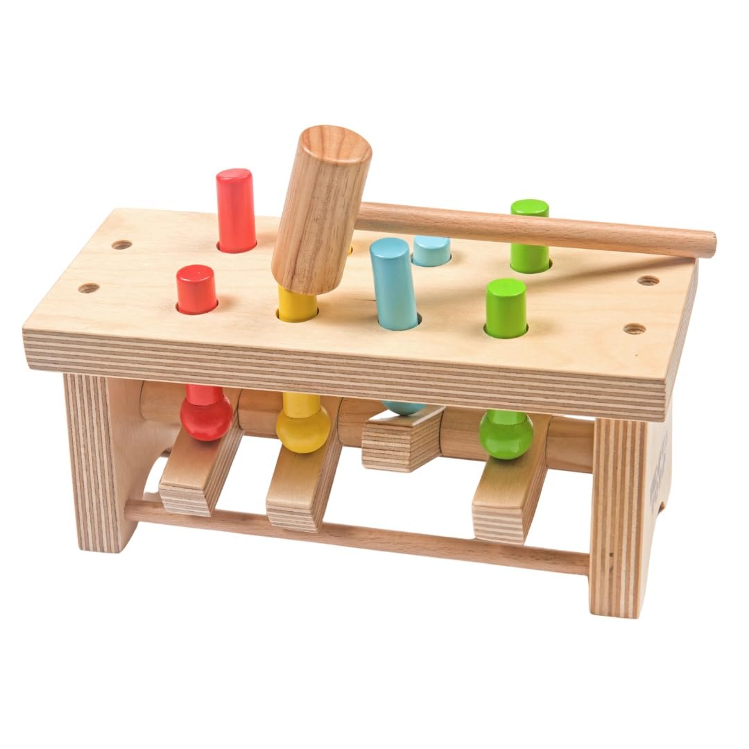 SKILL DEVELOPMENT – Fine Motor Skills, Hand-Eye Coordination, Sensory Development, Cognitive Development. The wooden pounding bench and hammer toy helps babies learn cause and effect as they pound the pegs and watch them pop up!
