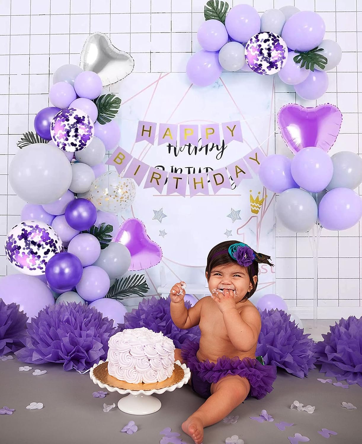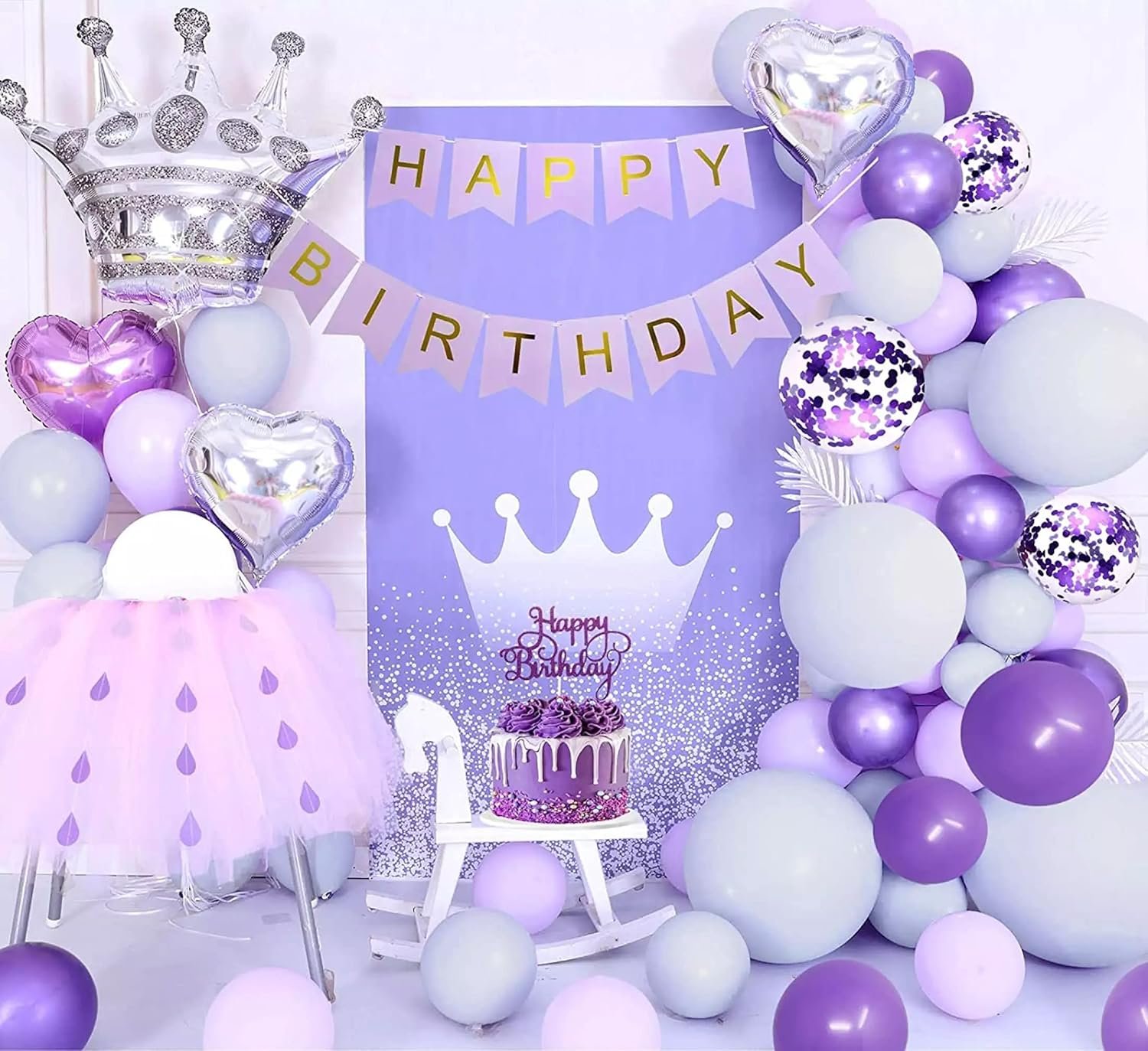 ALL-IN-ONE PRINCESS THEME BIRTHDAY DECORATION ITEMS KIT – This 49-piece combo includes everything you need for a complete princess theme birthday decoration setup: 1 “Happy Birthday” banner, 12 pastel purple balloons, 12 metallic purple balloons, 12 lavender balloons, 4 confetti balloons, 2 purple heart-shaped foil balloons, 2 silver heart foil balloons, 1 large silver crown foil balloon, 1 glue dot roll, 1 arch roll, and 1 purple cake topper. Perfect for an effortless and magical birthday decoration kit for girls, especially for birthday decoration, or any purple theme birthday decorations.