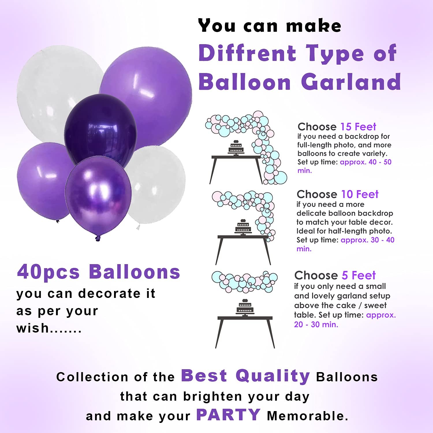 STUNNING PURPLE BIRTHDAY DECORATION KIT – This set includes a beautiful assortment of purple balloons for birthday decoration, and purple theme birthday decorations combining soft pastels and rich violet tones to suit any purple birthday decoration setup. Whether it’s for lavender colour birthday decoration or a dreamy princess theme birthday decoration, these purple balloons help set a magical tone ideal for birthday decoration kit for wife