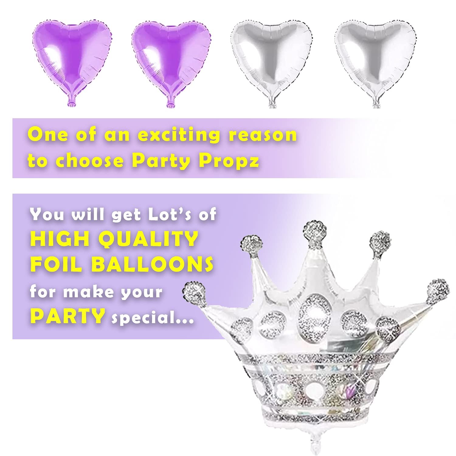 ROYAL TOUCH WITH FOIL BALLOONS & CROWN – Make your decoration birthday girl moment special with a silver crown foil balloon and heart-shaped foil balloons that match your purple birthday decoration kit. These elements elevate your setup, especially when paired with pastel balloons for decoration and other princess theme birthday decoration items.