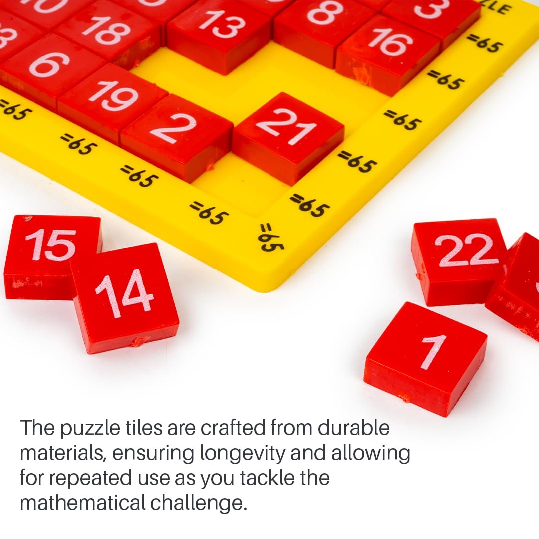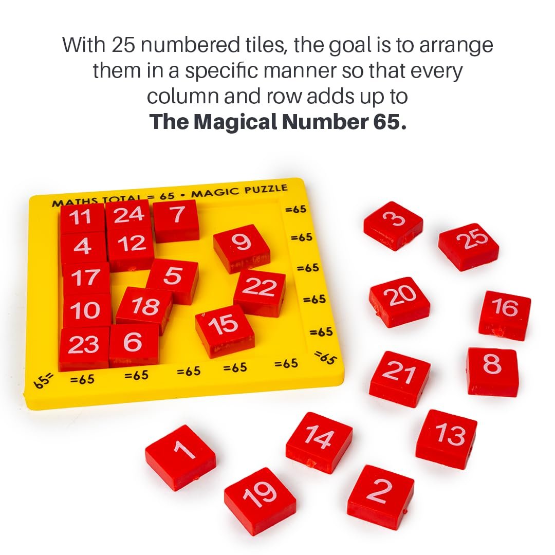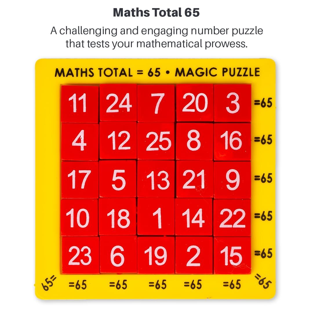 OBJECTIVE OF GAME: The objective of the Magic 65 Puzzle is to arrange the 25 tokens within the 5×5 grid in such a way that the sum of the numbers along every horizontal, vertical & diagonal line equals to 65.