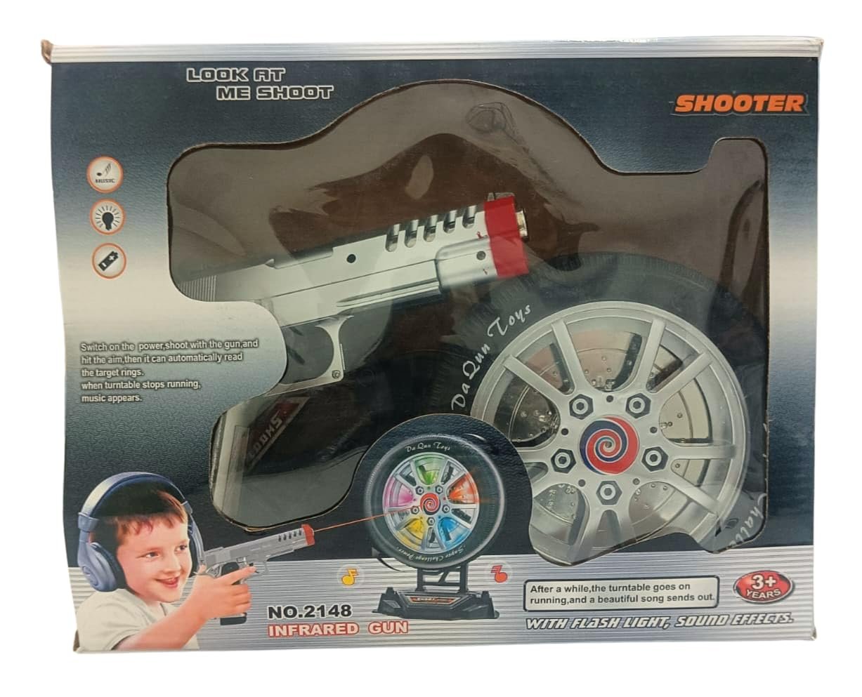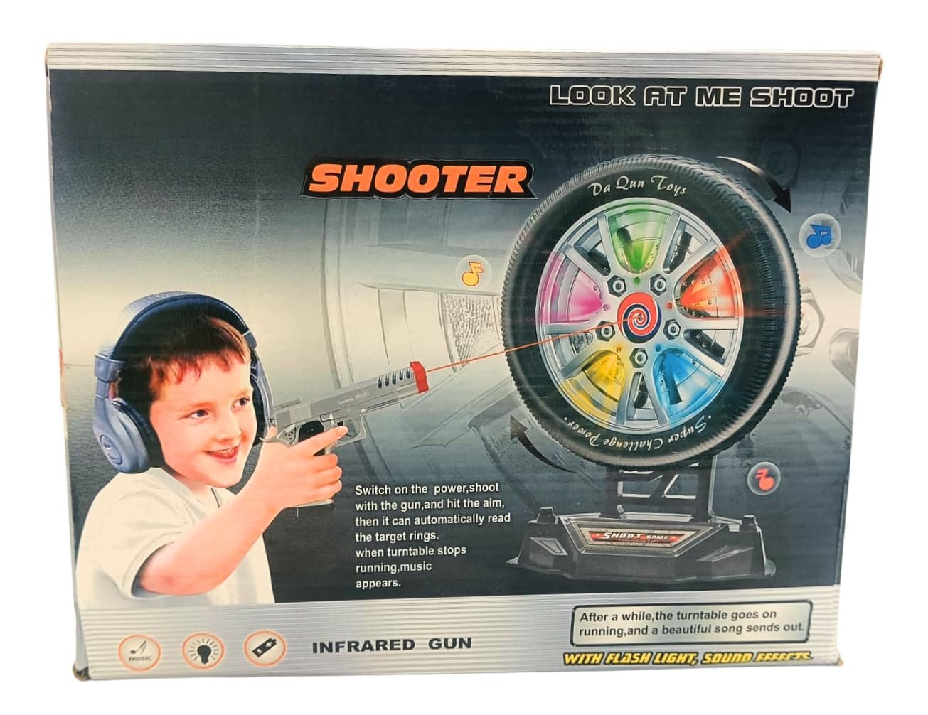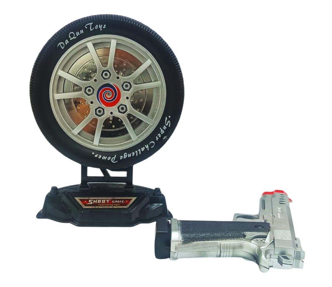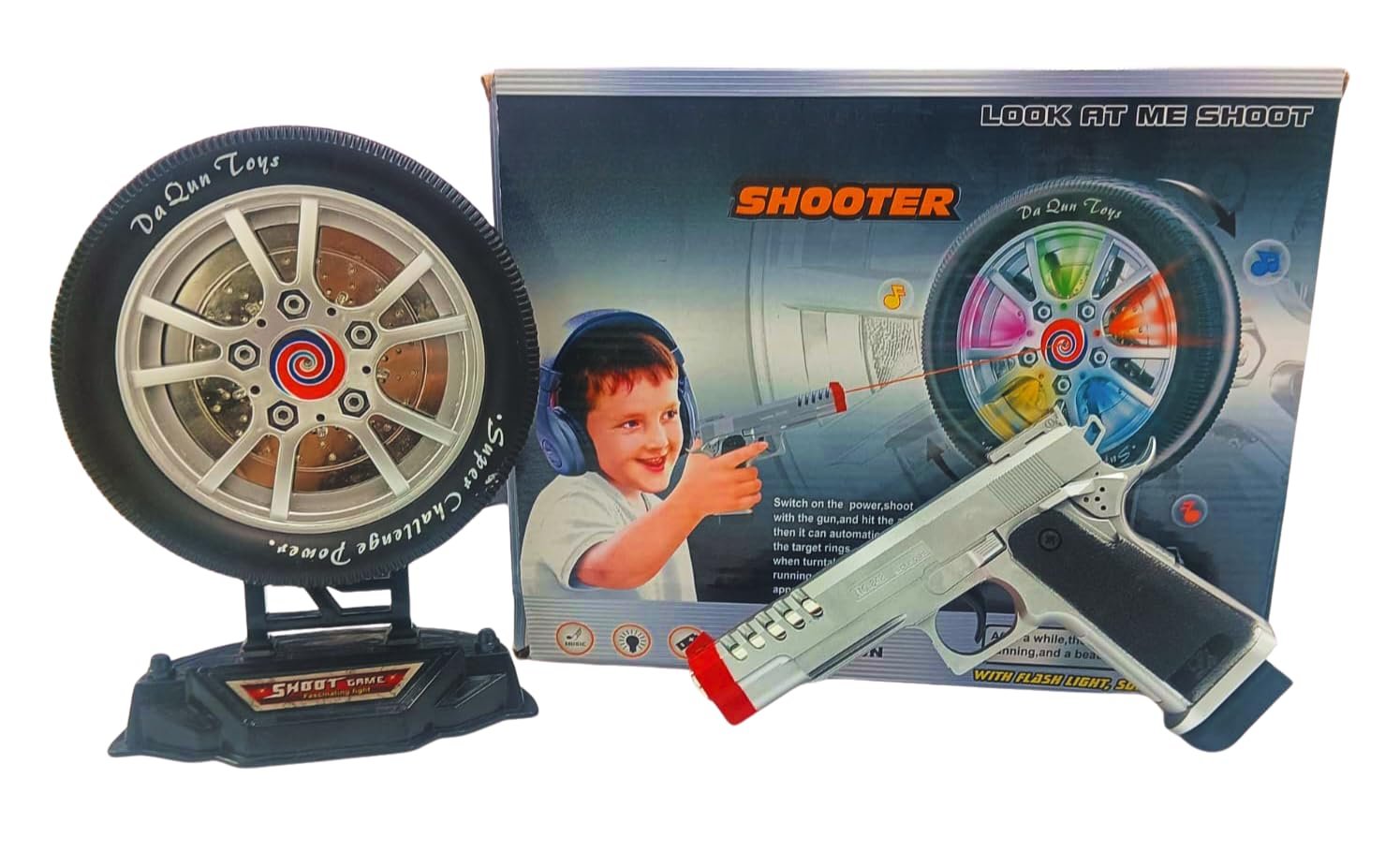COMPLETE SET: Includes one electronic rotating target wheel mounted on a sturdy base and one toy pistol for immediate play