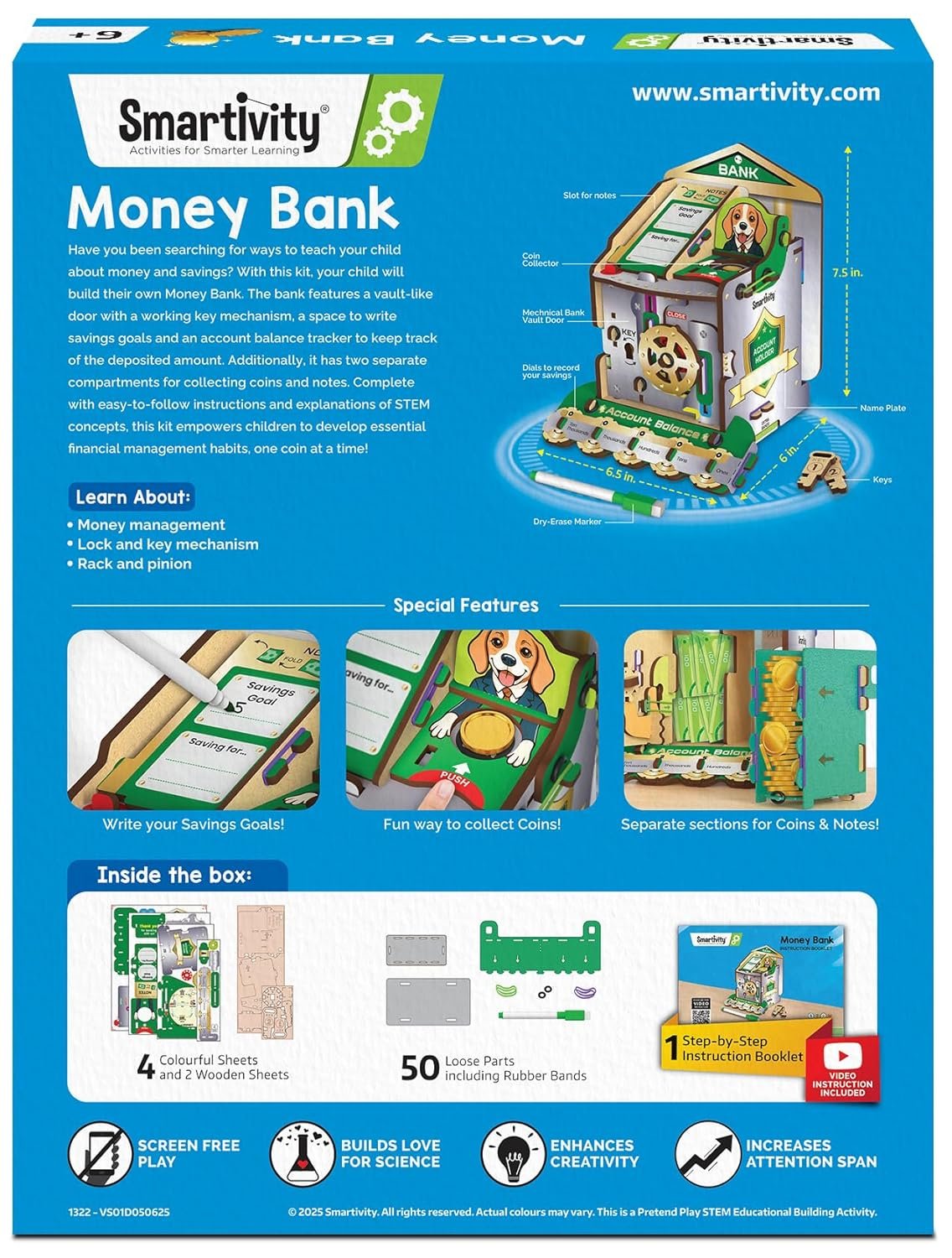 BUILD & LEARN MONEY MANAGEMENT: Inspire smart saving habits as your child constructs this engaging DIY Money Bank featuring 4 colored sheets, 2 wooden sheets, and 50 loose parts including rubber bands. Designed to teach essential financial literacy skills while having fun.