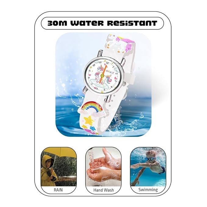 [Water-Resistant for everyday play] Let your kids be kids! Our Watch is water resistant, making it ideal for everyday play, handwashing and accidental splashes. Note: Not suitable for swimming or diving.
