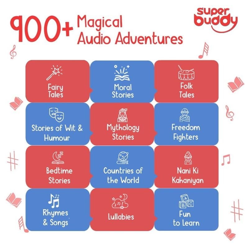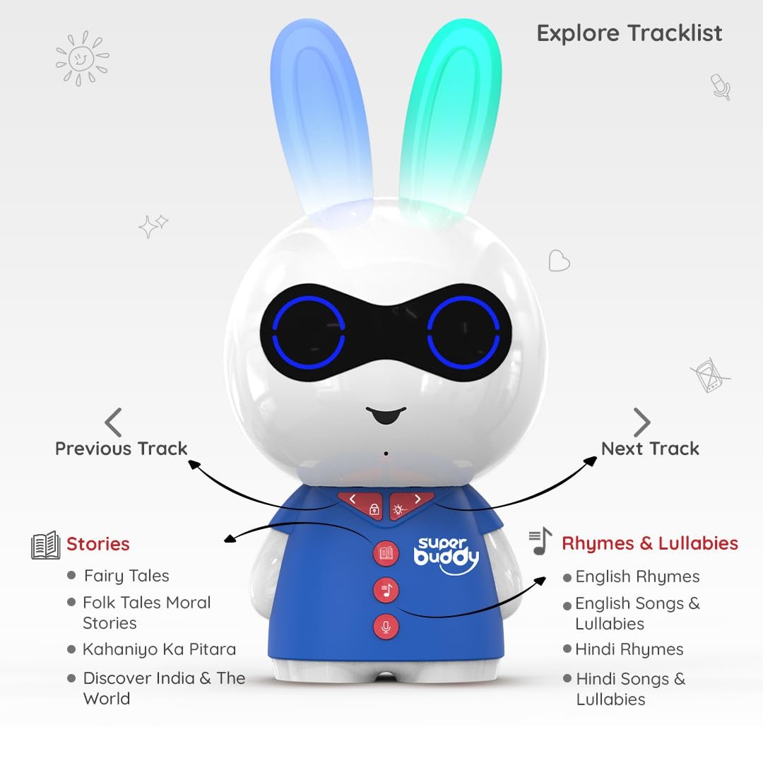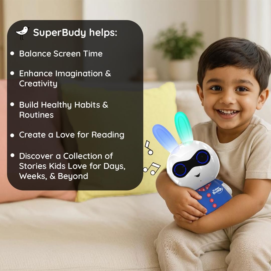 ๐ซ๐๐: SuperBuddy ensures a completely screen-free experience, helping reduce childrenโs exposure to excessive screen time. No apps, no screensโjust pure fun and learning through a thoughtfully curated collection of stories, songs, and rhymes. By providing engaging, educational content without the need for a screen, Rabbito helps parents strike the perfect balance between healthy play and screen time, supporting the development of positive digital habits while protecting children from screen addiction.