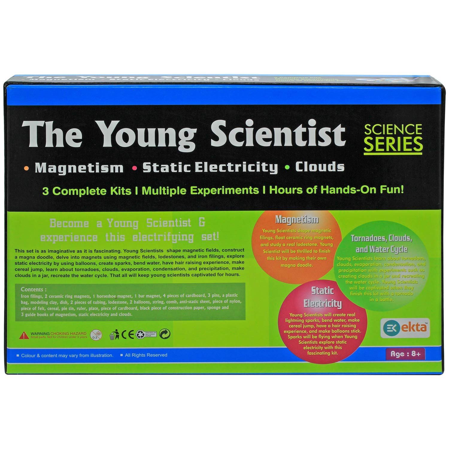 The young scientist set – 2 Become a young scientist and experience this electrifying set. 3 complete kits. Multiple experiments. Hours of hands on fun this set is imaginative as it is fascinating. Young scientists shape magnetic fields, construct a magna doodle, delve into magnets using magnetic fields, lodestones and iron fillings, explore static electricity by using balloons, create sparks, bend water, have hair raising experience, make cereal jump, learn about tornados, clouds, evaporation, condensation and precipitation, make clouds in a jar, recreate the water cycle. That all will keep young scientists captivated for hours. Contents: iron fillings 2 ceramic ring magnets 1 horseshoe magnet 1 bar magnet 4 pieces of cardboard 3 Pins. A plastic bag modeling clay dish 2 pieces of tubing lodestone 2 balloons string comb anti- static sheet piece of nylon piece of felt cereal pie tin ruler plate piece of cardboard black piece of construction paper sponge guide books of magnetism, static electricity and clouds for ages 8+ .This is a Science kit. A part of one of the three young scientist kits available with us. It helps your kid to learn the basics of Science by doing some in home experiments and learning about the various laws of science.