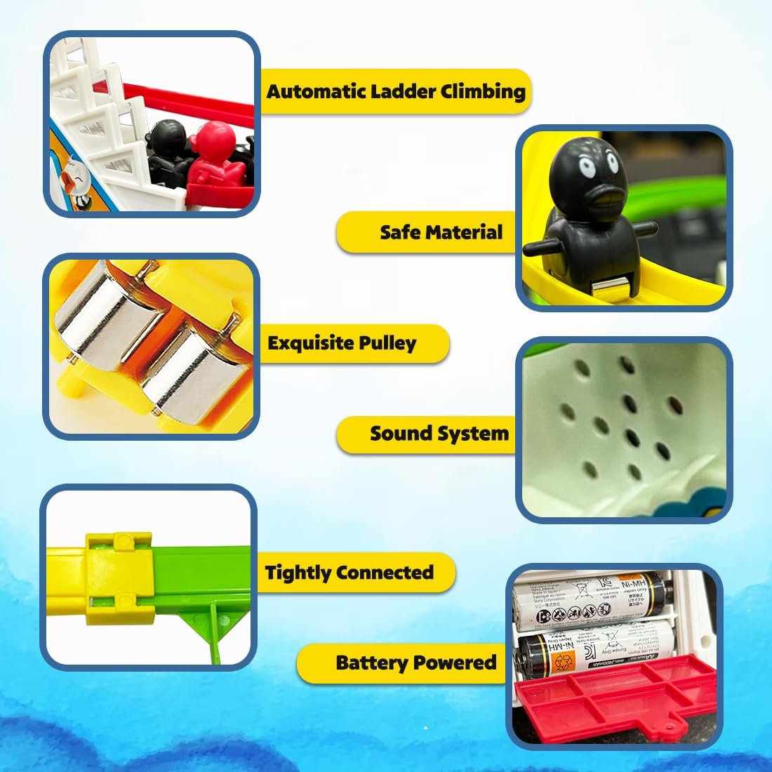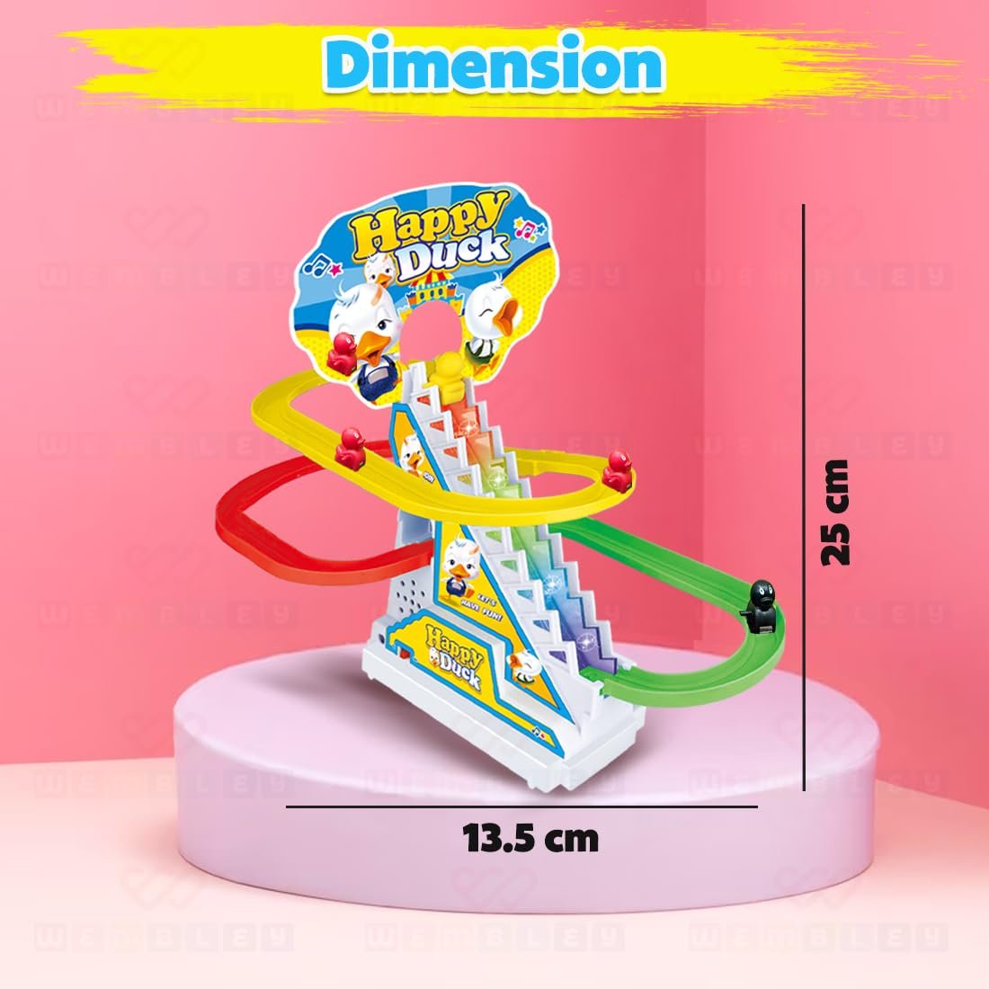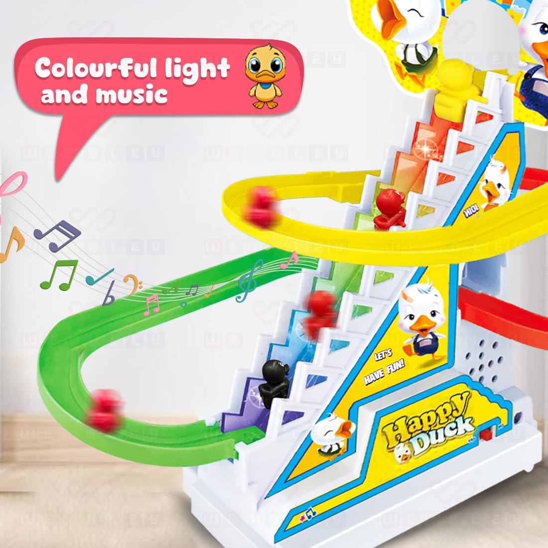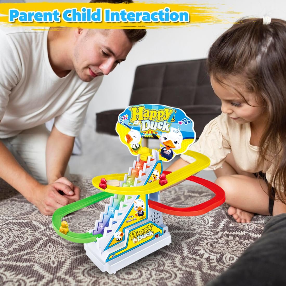 AUTOMATIC STAIR-CLIMBING MECHANISM: The toy features a smart escalator-like mechanism that effortlessly lifts the ducks to the top of the stairs. Kids will be fascinated by the automatic movement, which mimics the function of an escalator, keeping them engaged as they watch the ducks slide down and repeat the cycle.