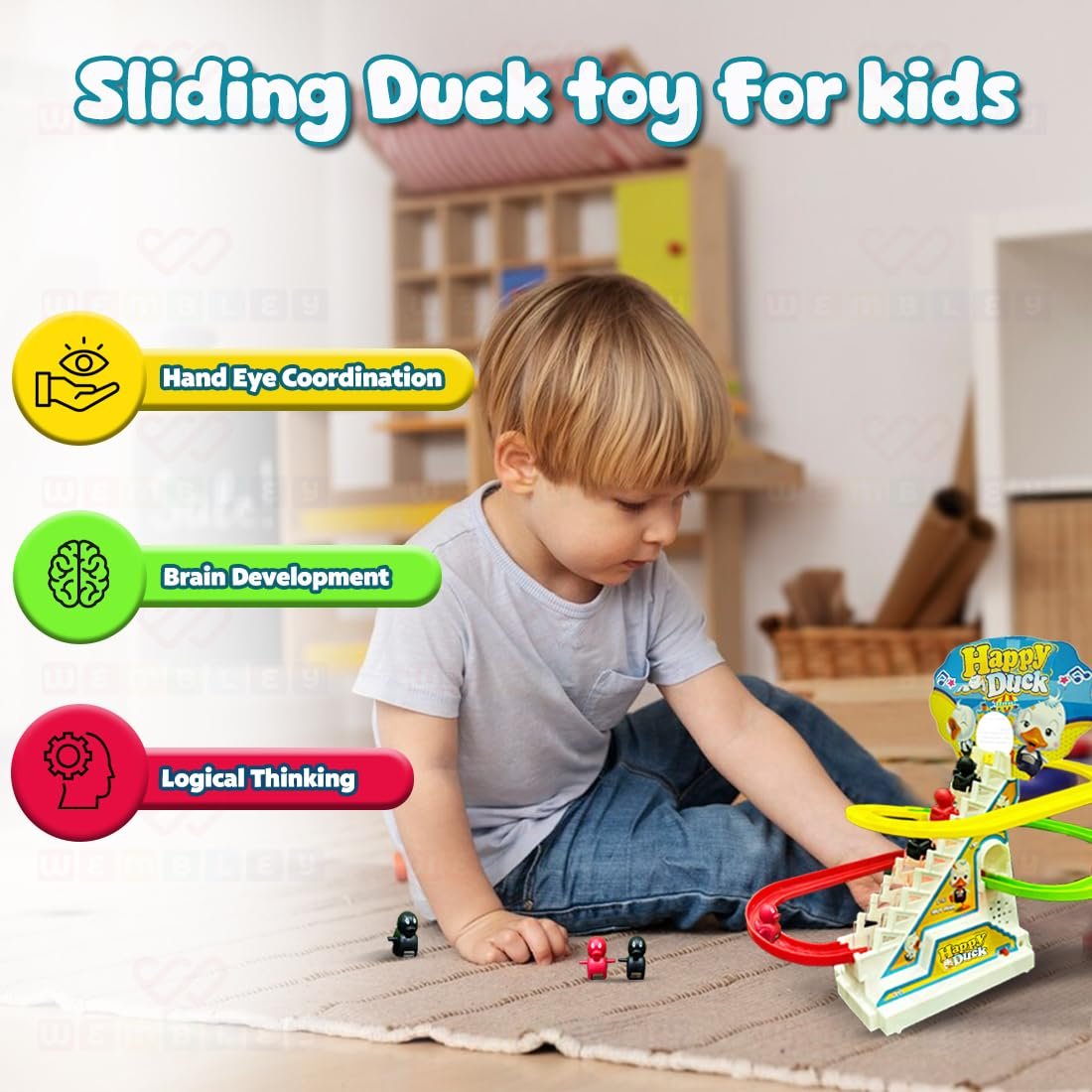 EASY ASSEMBLY AND BATTERY OPERATED: The Wembley Duck Track Set is easy to assemble, ensuring that kids can start playing right away. Powered by 2 x 1.5V “AA” batteries (not included), the toy offers long-lasting enjoyment with its mesmerizing music and light functions, making it a perfect gift for toddlers, boys, and girls alike.
