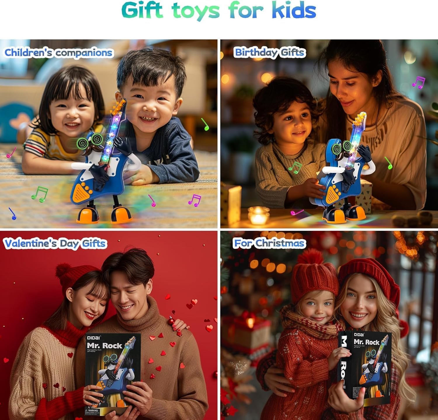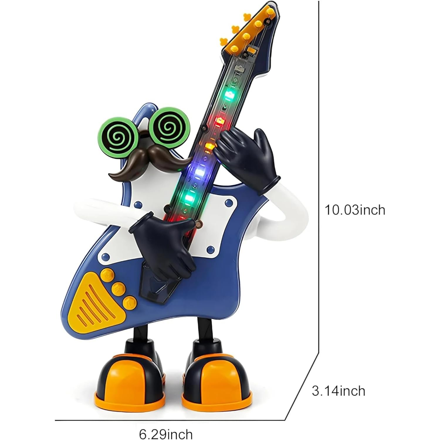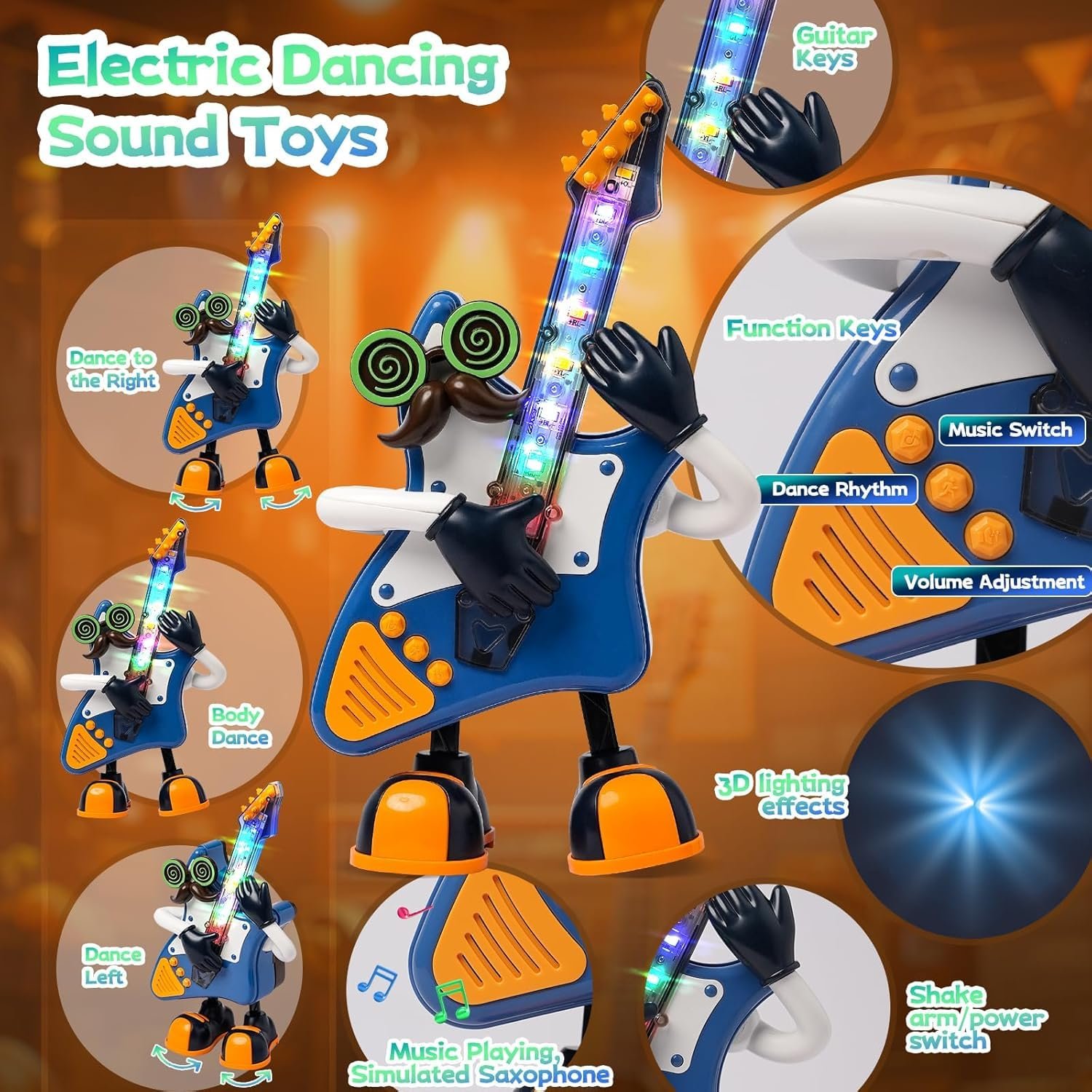 Music and Light Feature: The guitar toy brings excitement to playtime with lively rock tunes and animated dance actions. Its guitar-inspired design sways rhythmically while flashing vibrant 3D lights, creating a playful performance that keeps kids entertained and engaged.