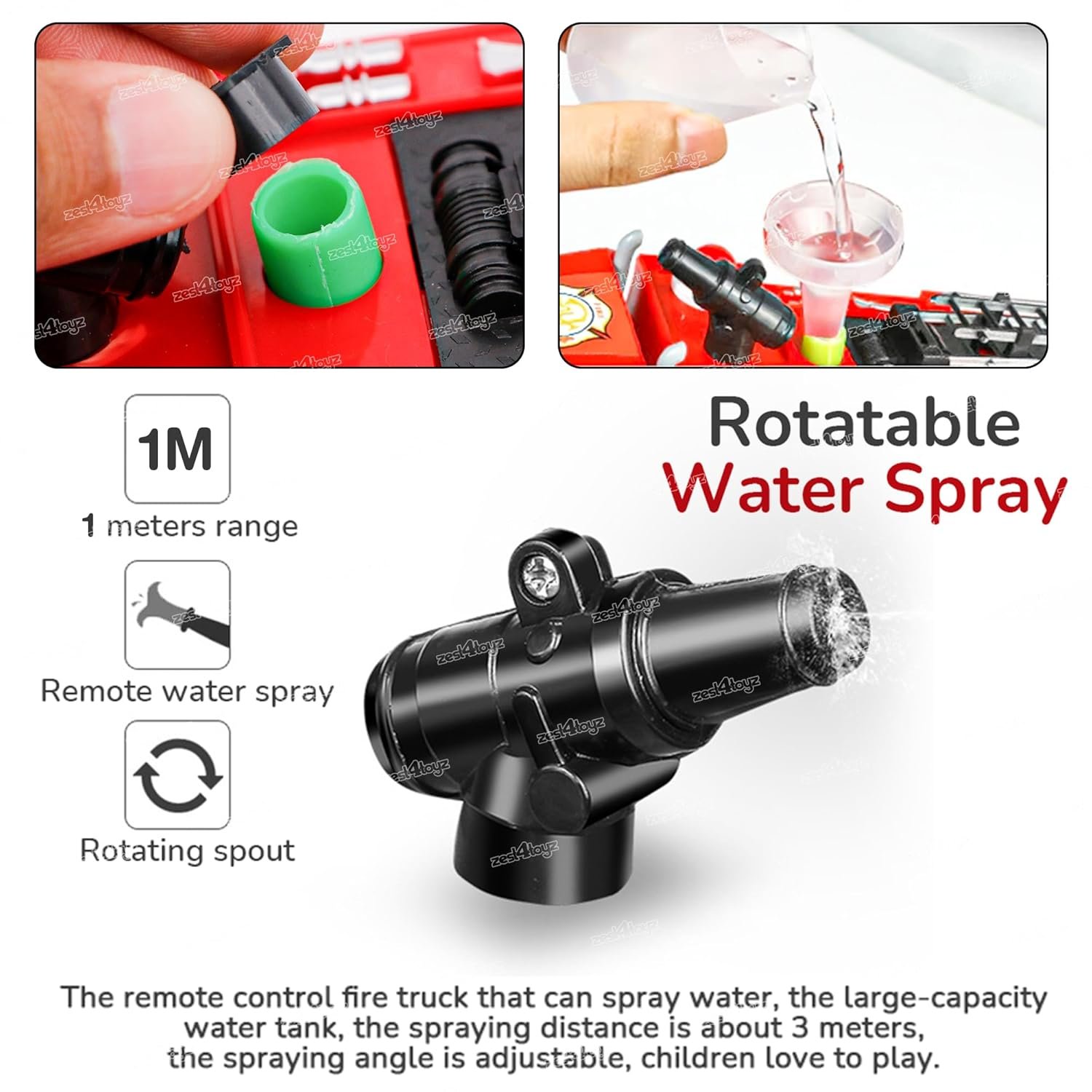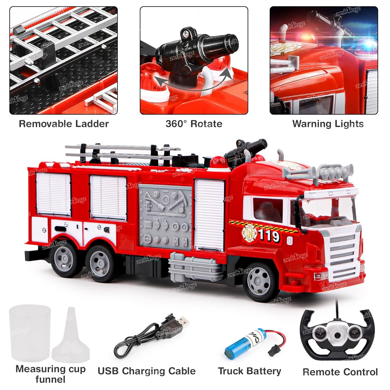💦 WATER JET SPRAY FUNCTION: Features a rotatable water nozzle with a large tank that sprays water up to 1 meter. Easy to refill using the included funnel and measuring cup—kids will love aiming and spraying like real firefighters!